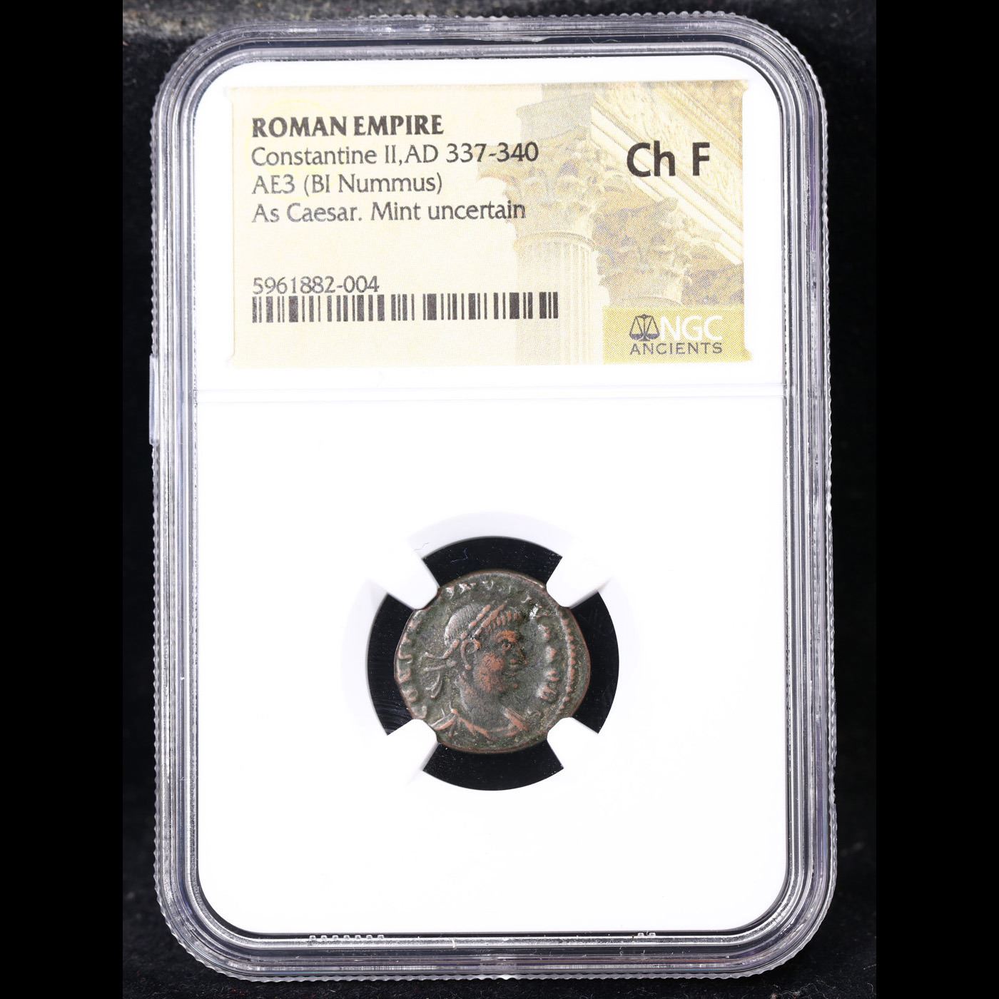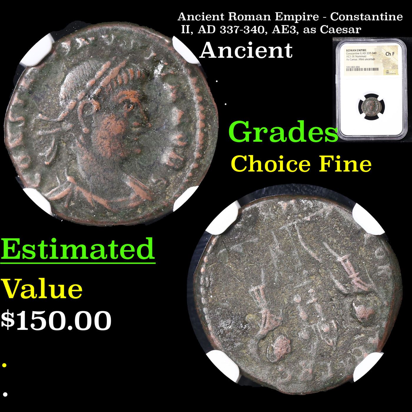 NGC Ancient Roman Empire - Constantine II, AD 337-340, AE3, as Caesar Graded Choice Fine By NGC. Roman coins were first produced in the late 4th century BCE in Italy and continued to be minted for another eight centuries across the empire. Denominations and values more or less constantly changed but certain types such as the sestertii and denarii would persist and come to rank amongst the most famous coins in history. Roman coinage, as in other societies, represented a guaranteed and widely recognized value which permitted an easy exchange of value which in turn drove both commerce and technology development as all classes could work to own coins which could be spent on all manner of goods and services. Even more significantly, large and identical payments could now be easily made which made possible a whole new scale of commercial activity. Coins also had a function as a vehicle to spread the imagery of the ruling class as coinage was the mass media of the day and often carried likenesses of emperors and famous imperial monuments which would be the nearest most Romans ever got to see of them.
