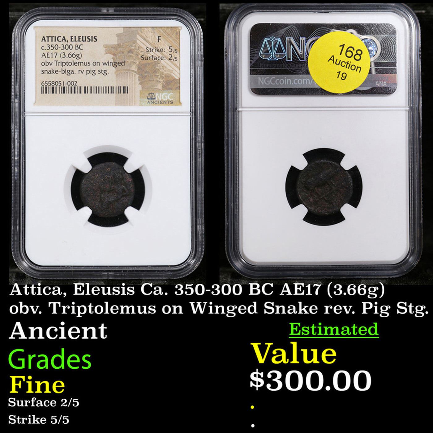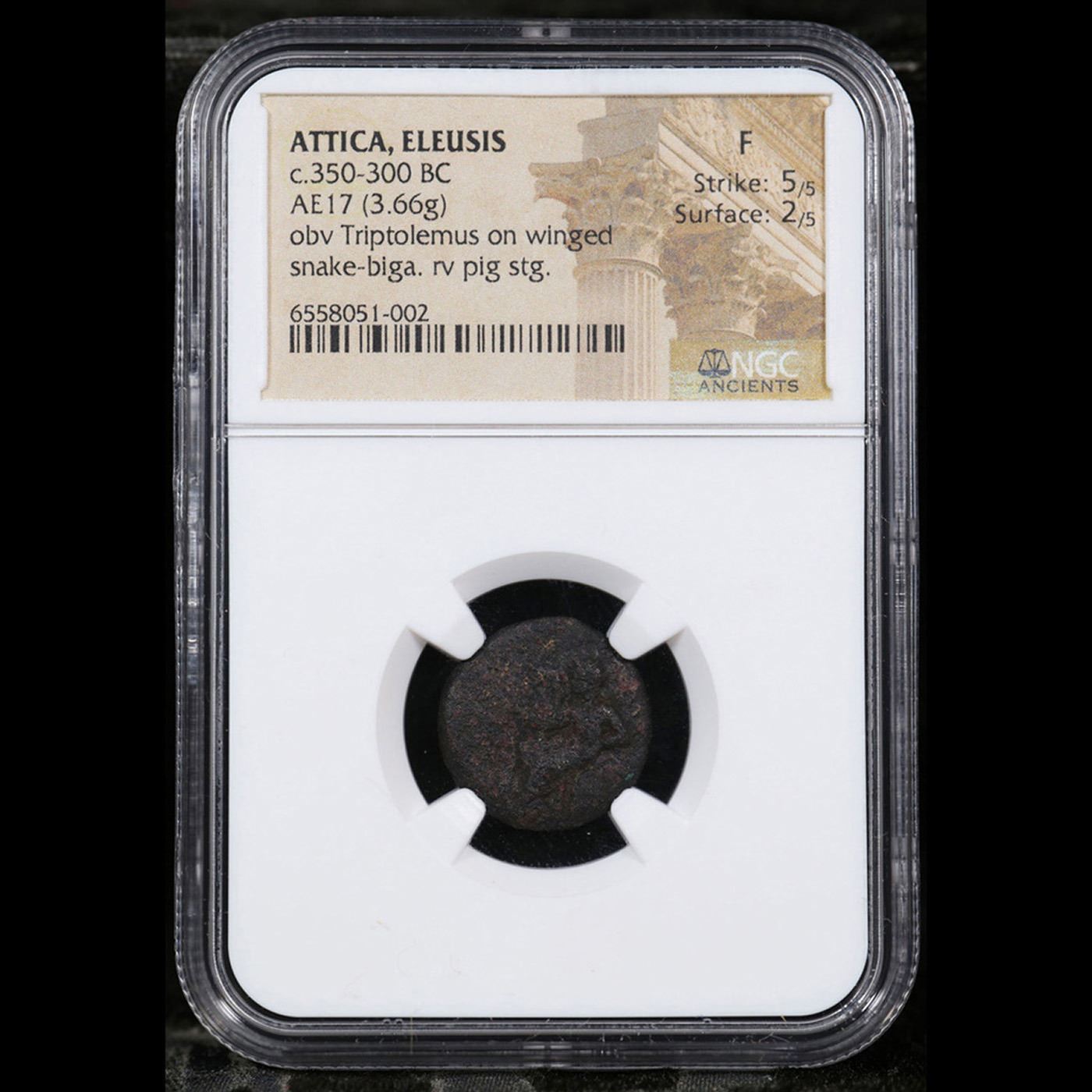 NGC Attica, Eleusis Ca. 350-300 BC AE17 (3.66g) obv. Triptolemus on Winged Snake rev. Pig Stg. Graded Fine By NGC. The Slabbing Alone Costs $50 A Key Date's Pick