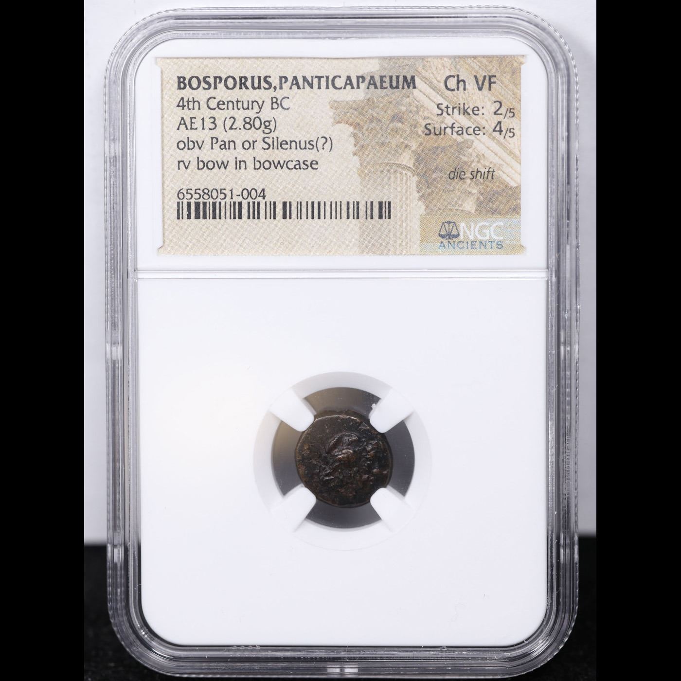 NGC Bosporus, Panticapaeum 4th Century BC AE13(2.80g) obv Pan or Silenus rv bow in bowcase Graded Ch VF By NGC. The Cost Of Slabbing Alone is $50 A Key Date's Pick