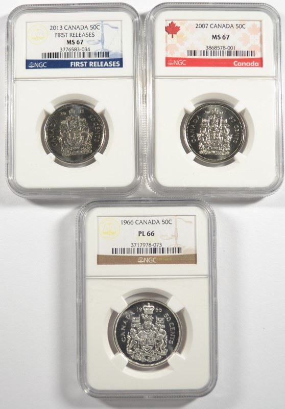 NGC GRADED CANADIAN HALF DOLLARS: 1966 PL-66, 07 MS-67 & 2013 MS-67 1st RELEASES