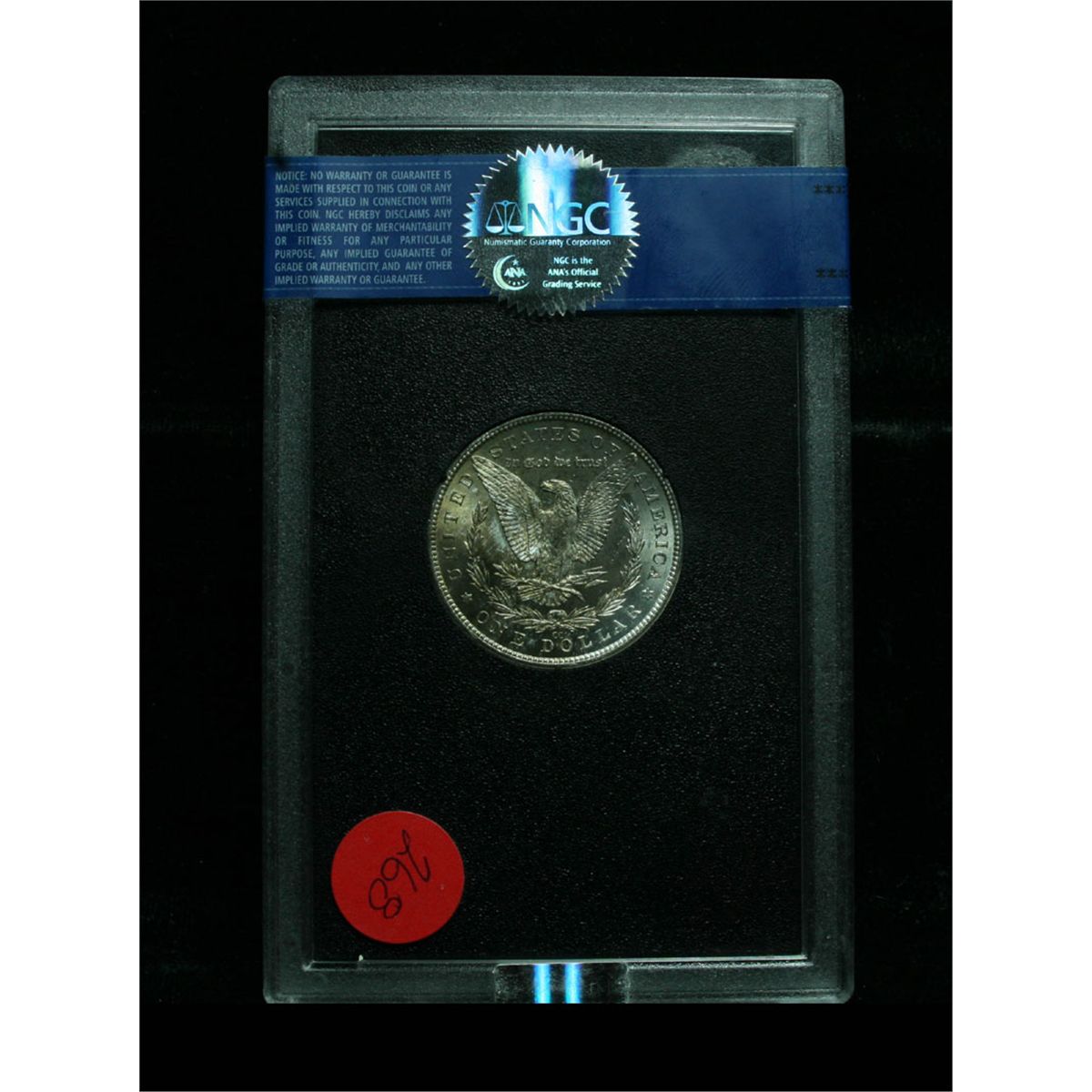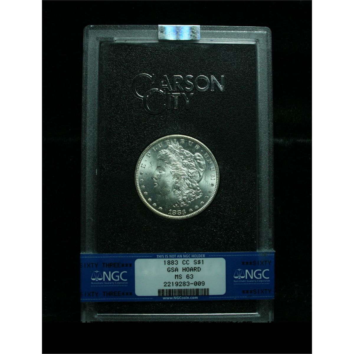 Very nice example with good eye appeal. The Obverse is blast white. The reverse is nicely toned with golds and greens. After the US Government audited its vaults in the mid 70's they found a Hoard of Morgan Dollars in the basement vault in the federal reserve. Between 1973 and 1980 the Government Services Administration (GSA) Packaged these rare Morgan dollars and auctioned them off to the public. This example is the 1883-cc Carson City Morgan with the original box and the COA. Estimated Value $250