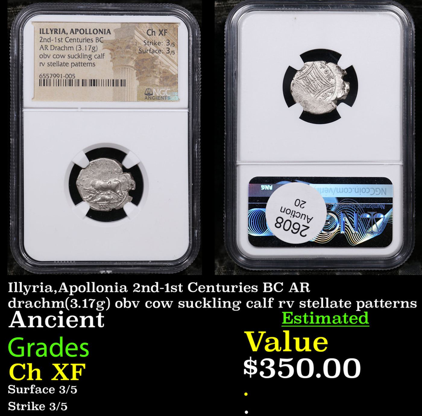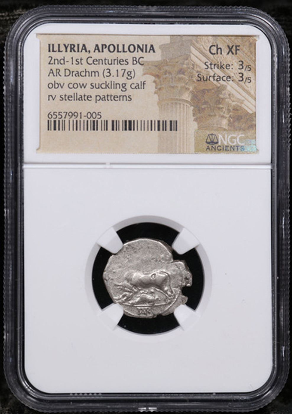 NGC Illyria,Apollonia 2nd-1st Centuries BC AR drachm(3.17g) obv cow suckling calf rv stellate patterns Graded Ch XF By NGC. The Cost Of Slabbing Alone is $50 A Key Date's Pick