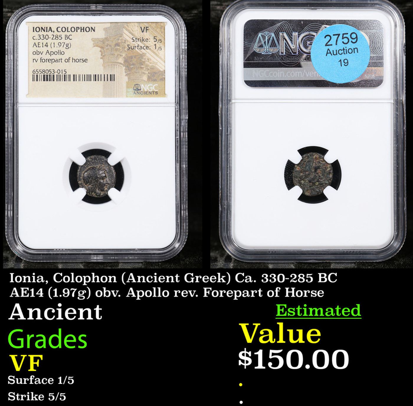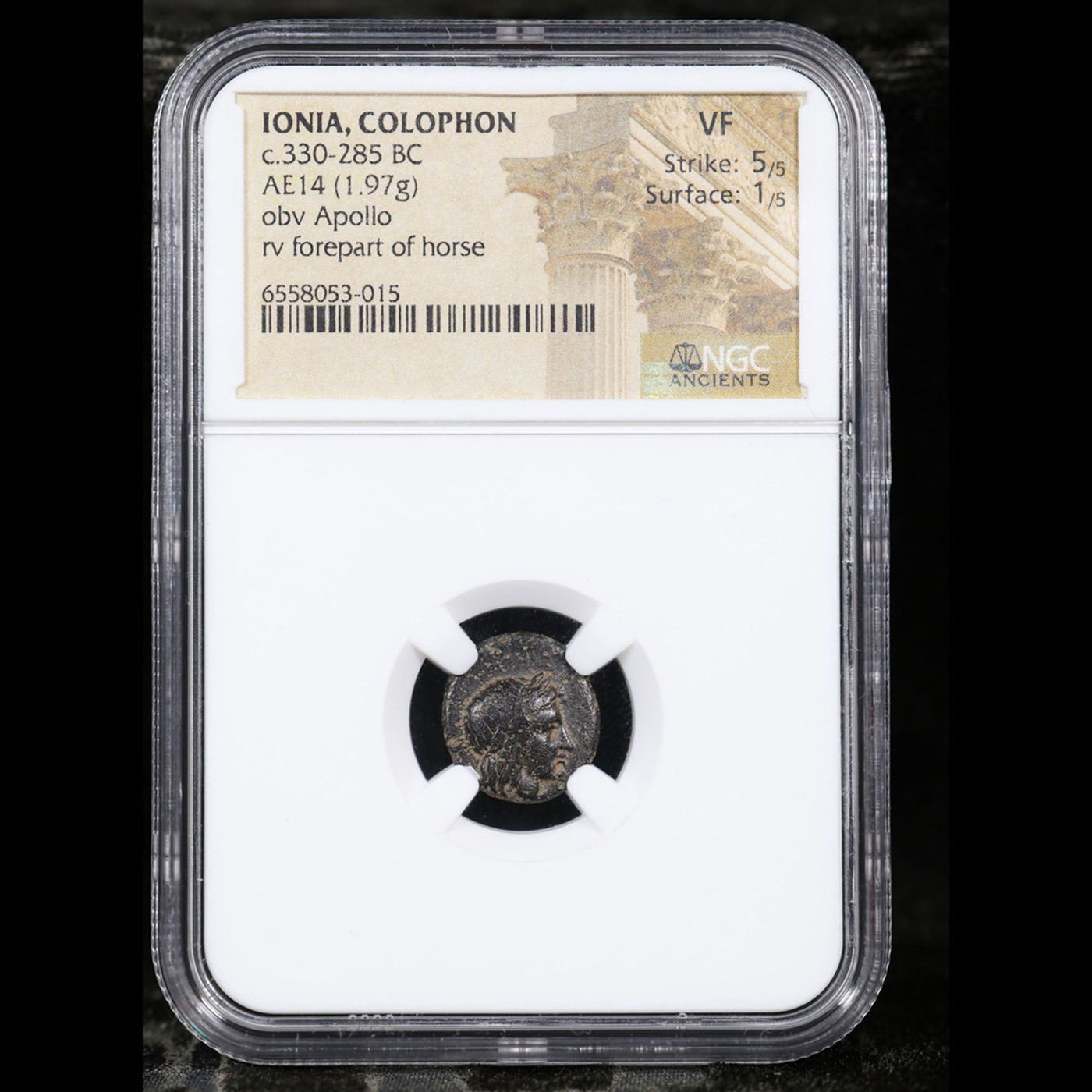NGC Ionia, Colophon (Ancient Greek) Ca. 330-285 BC AE14 (1.97g) obv. Apollo rev. Forepart of Horse Graded VF By NGC. The Slabbing Alone Costs $50 A Key Date's Pick