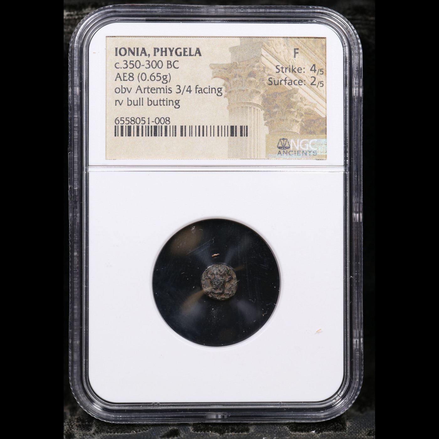 NGC Ionia,Phygela c.350-300 BC AE8(0.65g) obv Artemis 3/4 facing rv bull butting Graded Fine By NGC. The Cost Of Slabbing Alone is $50 A Key Date's Pick