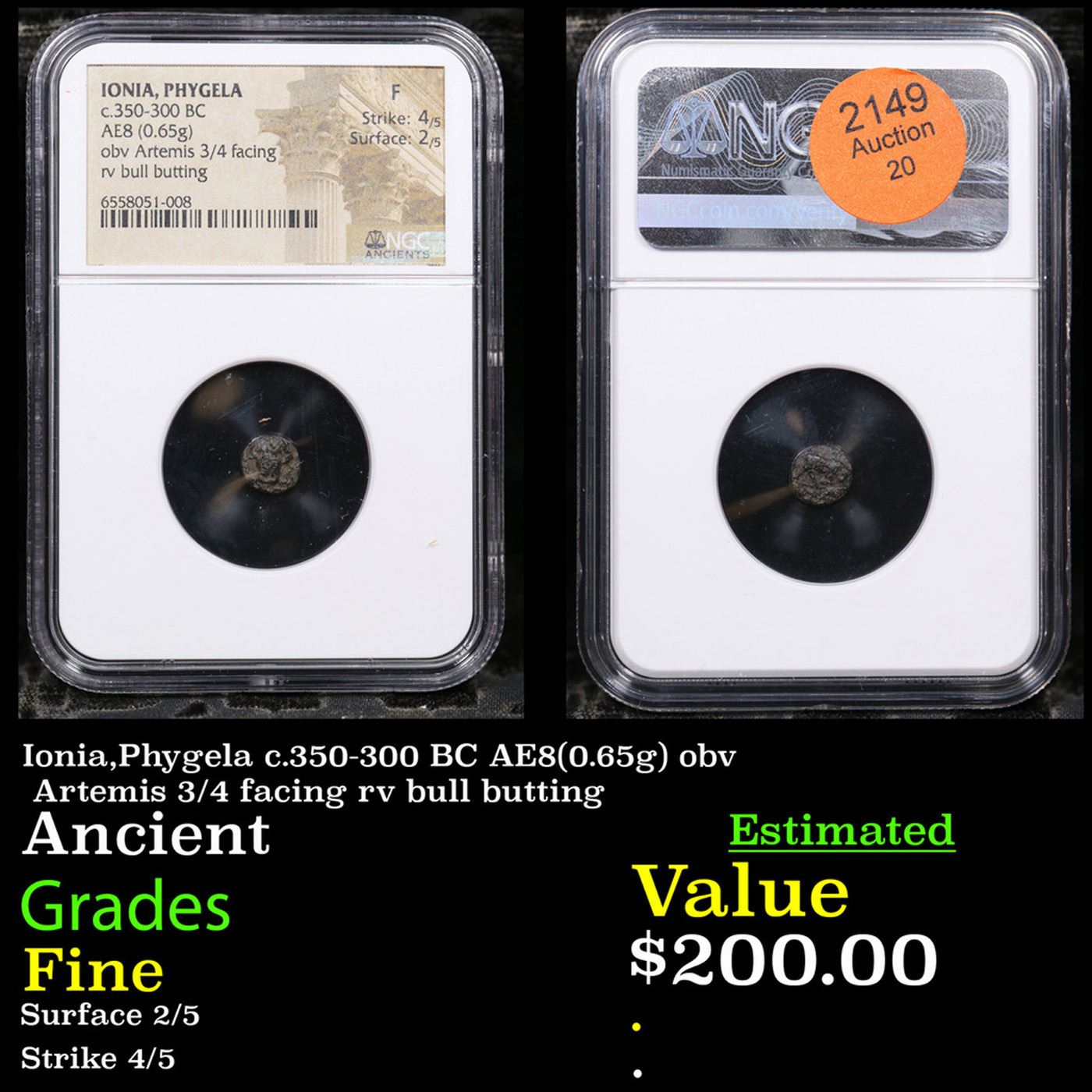 NGC Ionia,Phygela c.350-300 BC AE8(0.65g) obv Artemis 3/4 facing rv bull butting Graded Fine By NGC. The Cost Of Slabbing Alone is $50 A Key Date's Pick