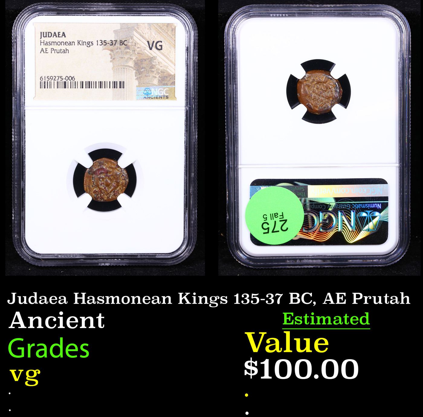 NGC Judaea Hasmonean Kings 135-37 BC, AE Prutah Graded vg By NGC.