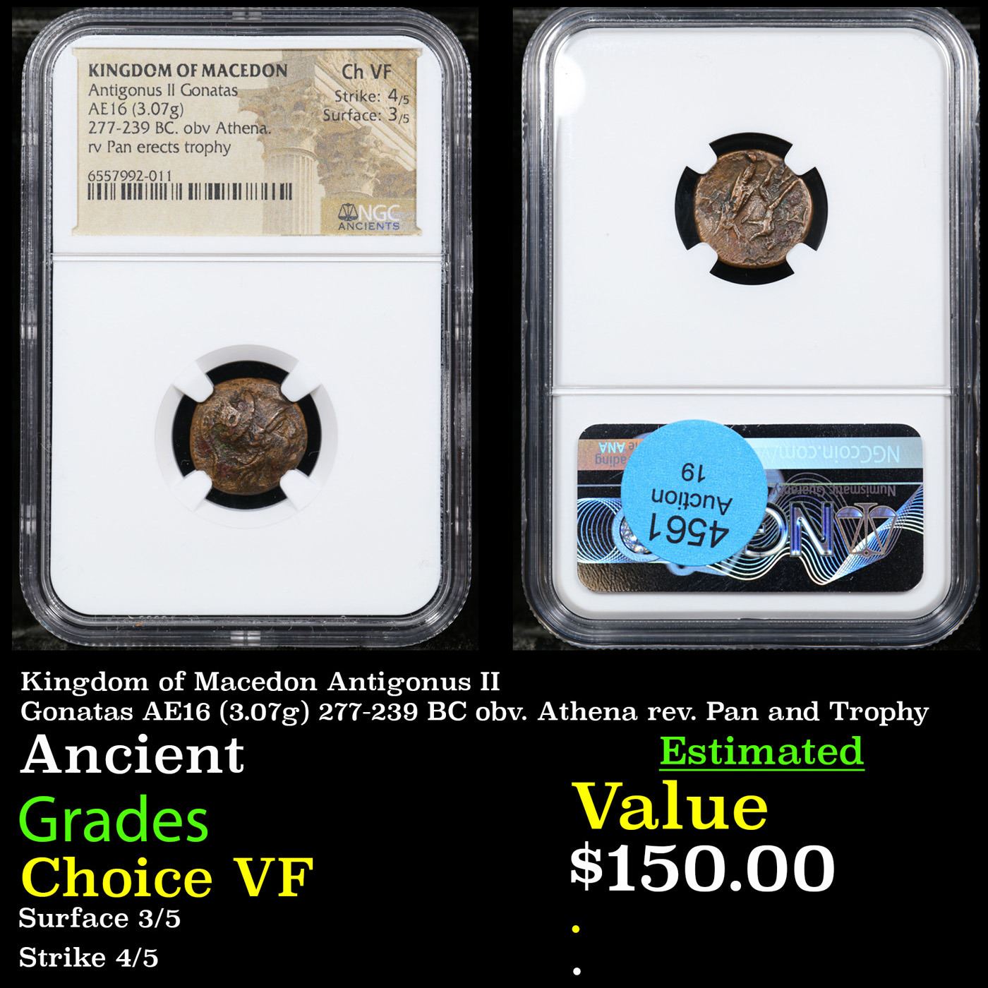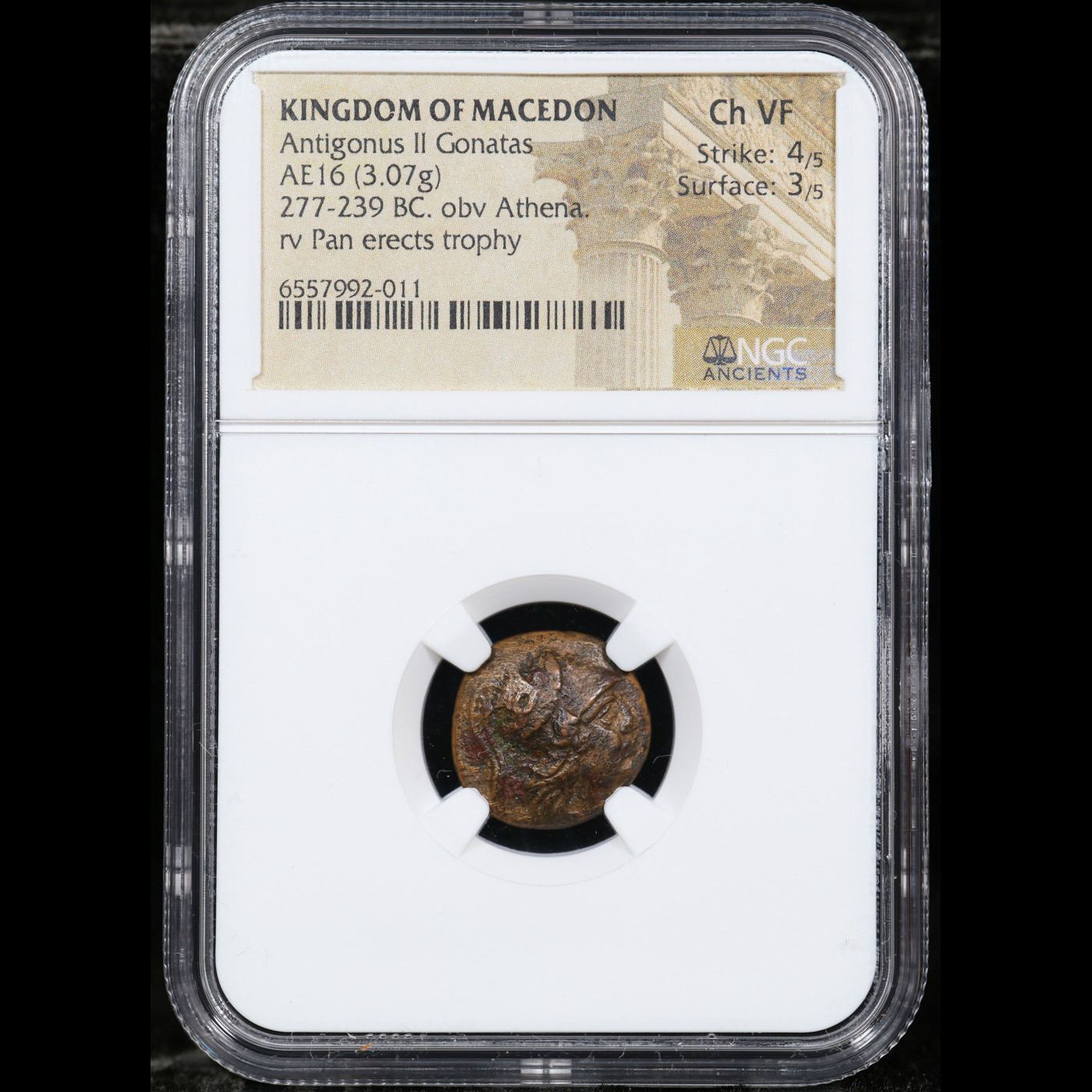 NGC Kingdom of Macedon Antigonus II Gonatas AE16 (3.07g) 277-239 BC obv. Athena rev. Pan and Trophy Graded Choice VF By NGC. The Slabbing Alone Costs $50 A Key Date's Pick