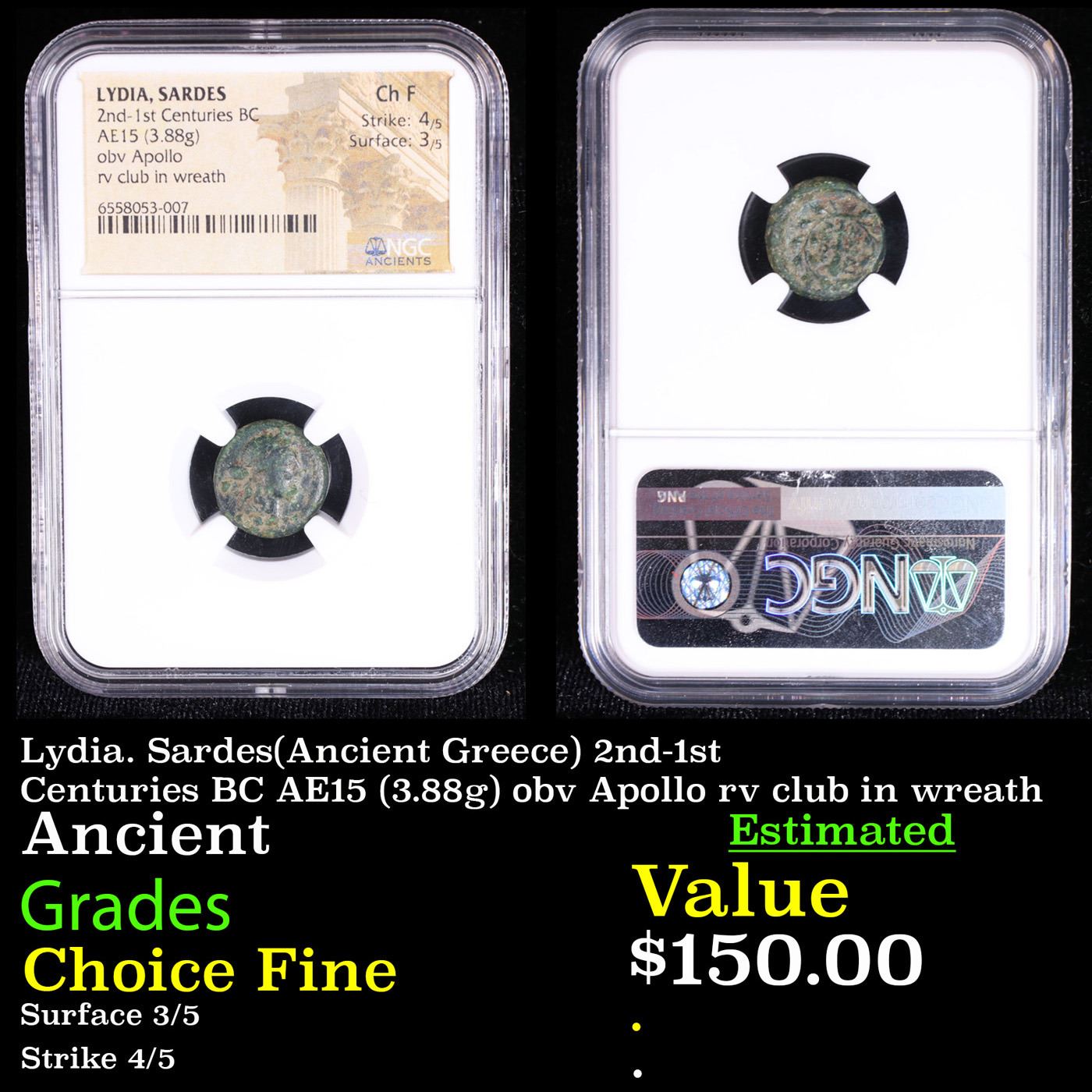 NGC Lydia. Sardes(Ancient Greece) 2nd-1st Centuries BC AE15 (3.88g) obv Apollo rv club in wreath Graded Choice Fine BY NGC.