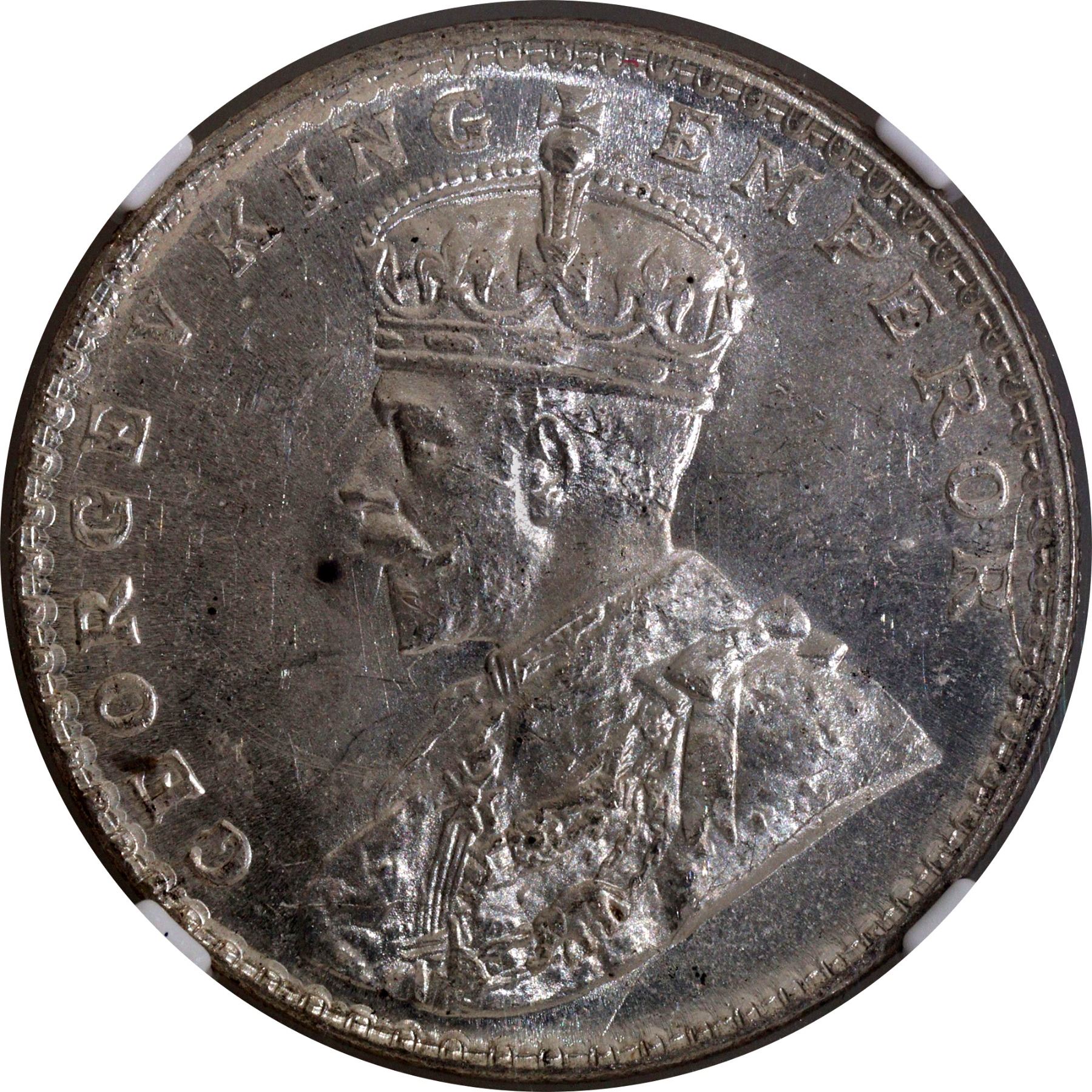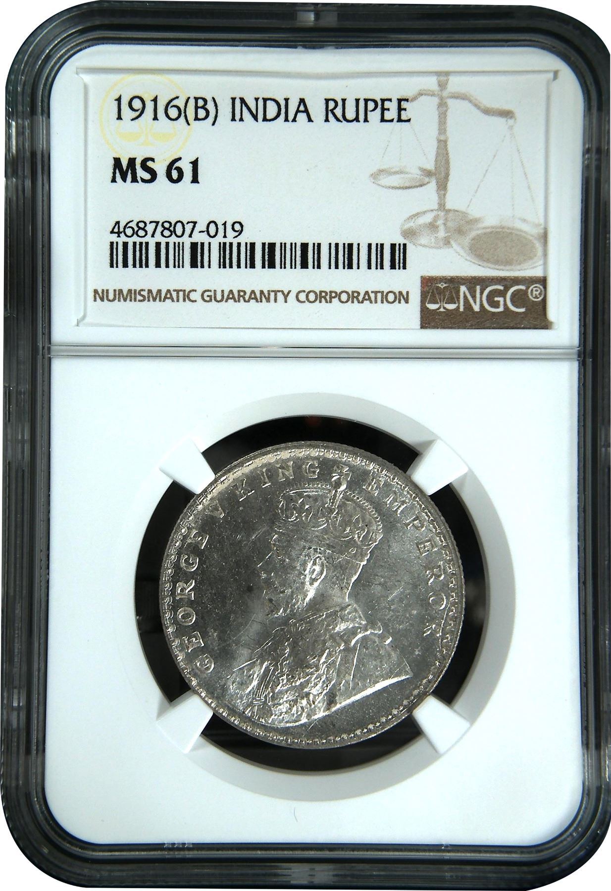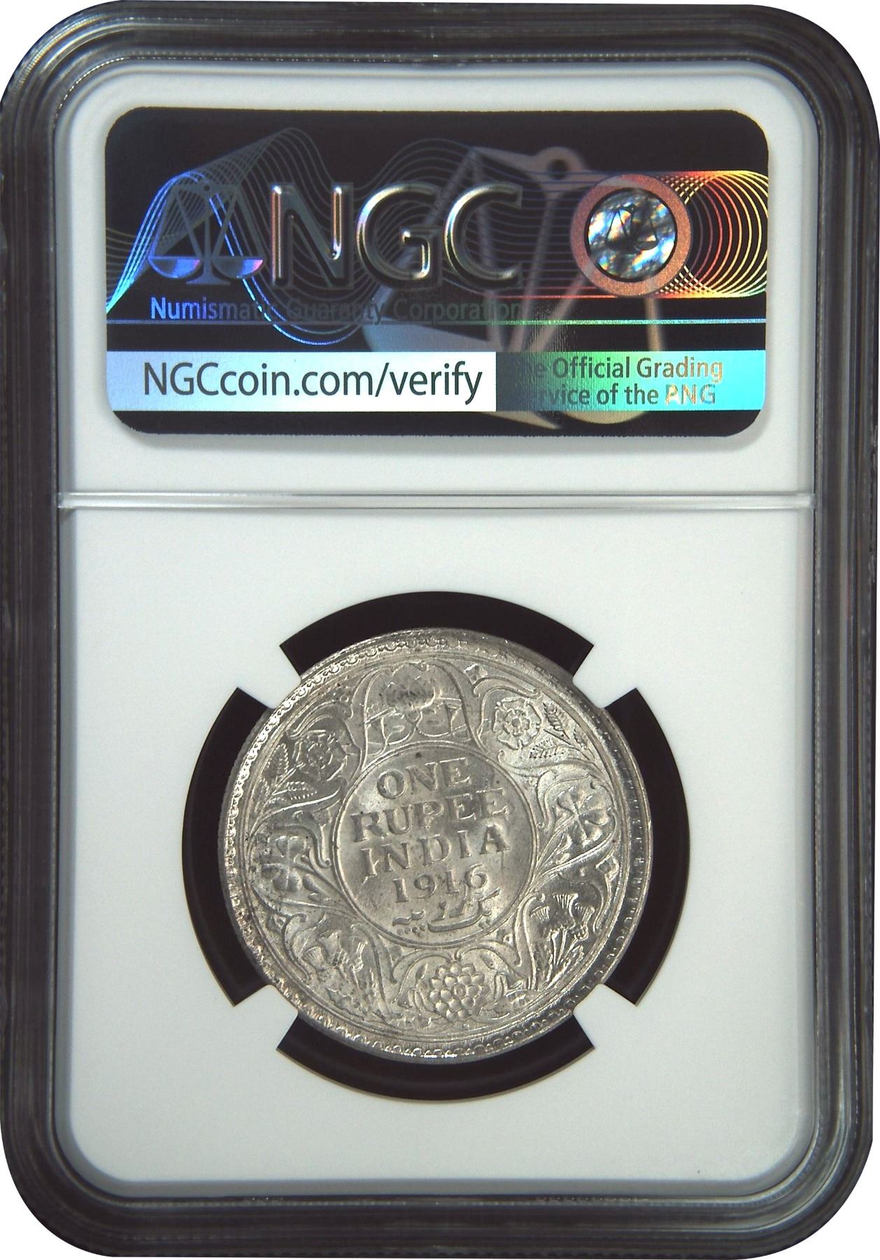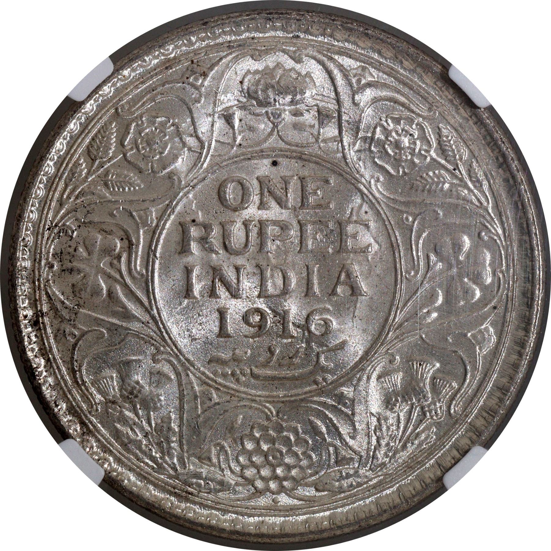 1916, King George V, Silver Rupee, Bombay Mint, dot, (PR # 222/GK # 1034), clear ghost image visible, graded & slabbed by NGC as MS 61.