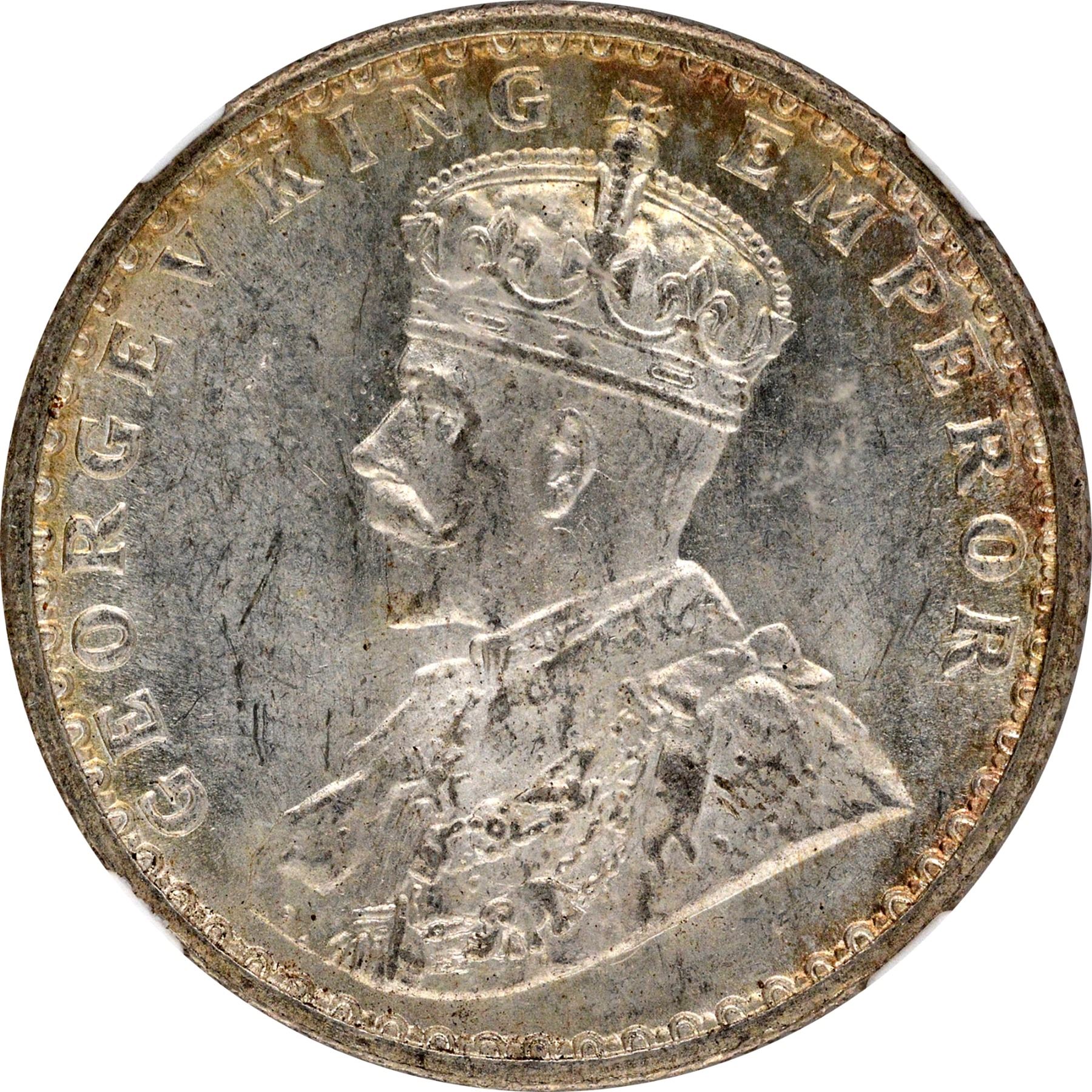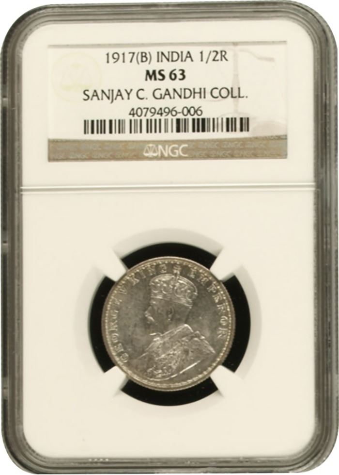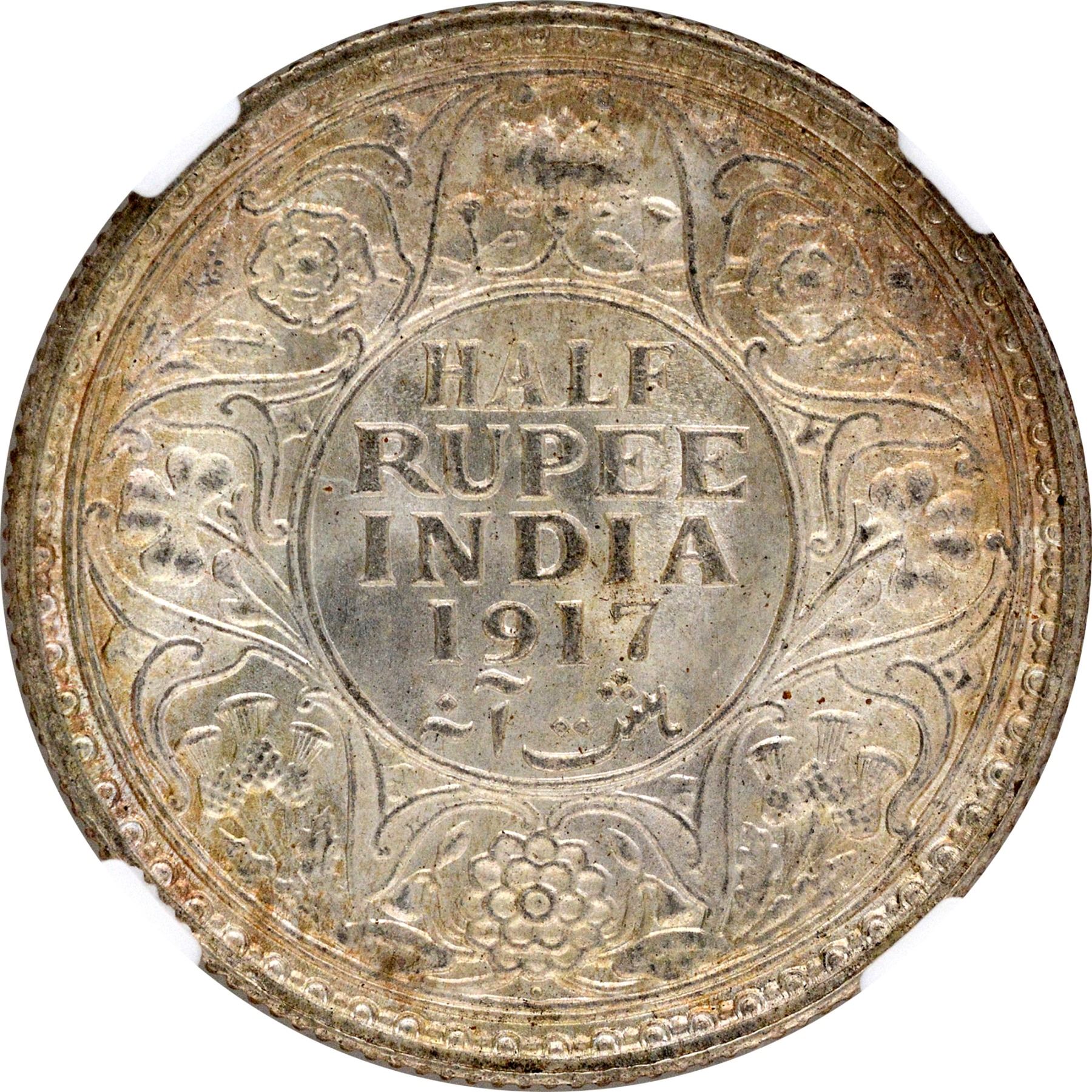 1917, King George V, Silver 1/2 Rupee, Bombay Mint, dot,(PR # 341/GK # 1055), little toning, graded & slabbed by NGC as MS 63, Scarce in this grade.