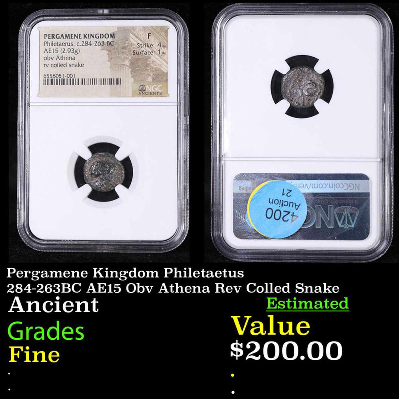 NGC Pergamene Kingdom Philetaetus 284-263BC AE15 Obv Athena Rev Colled Snake Ancient Graded Fine BY NGC. The Cost Of Slabbing Alone is $50