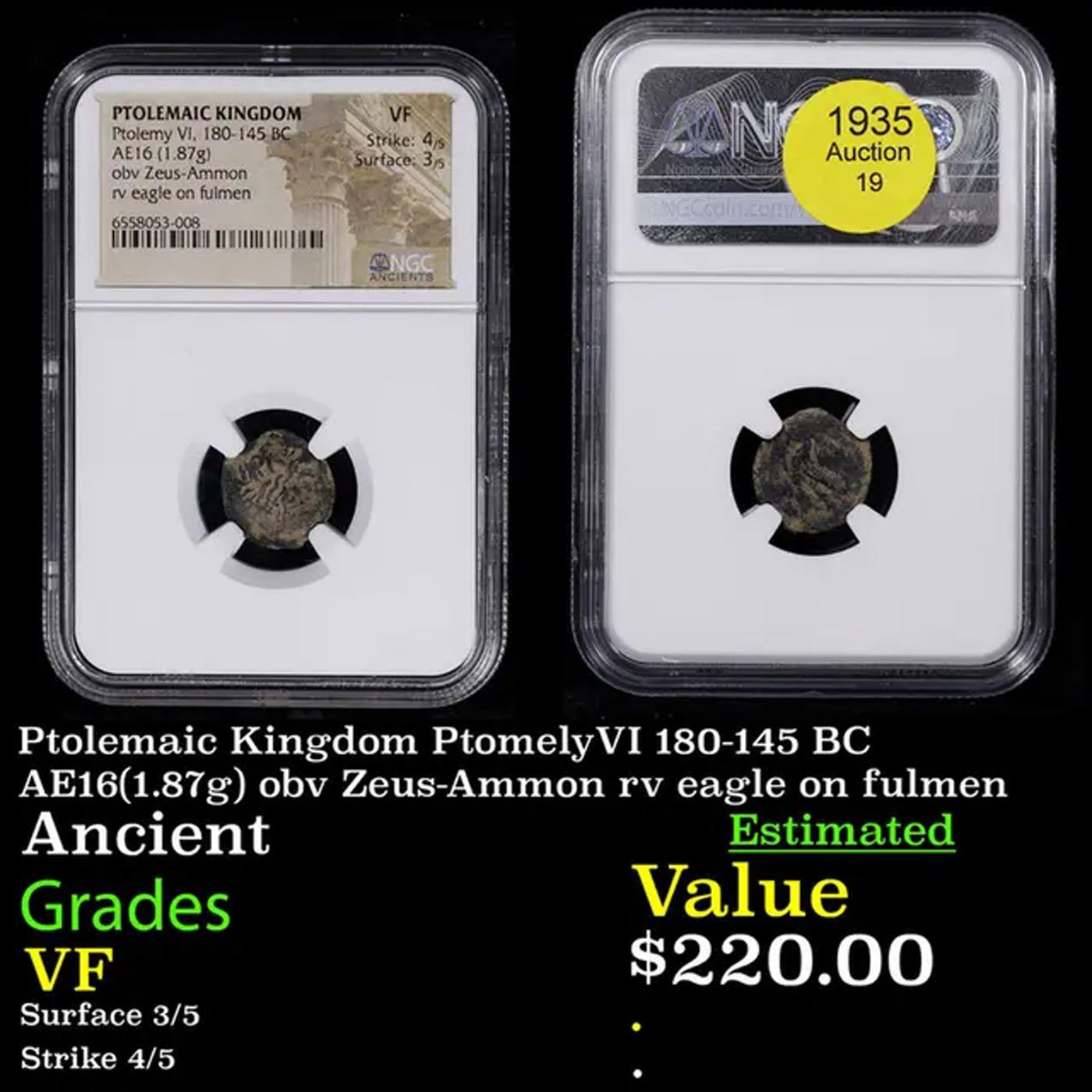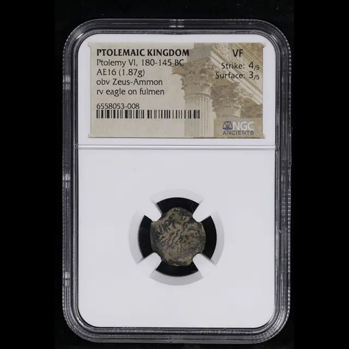 NGC Ptolemaic Kingdom PtomelyVI 180-145 BC AE16(1.87g) obv Zeus-Ammon rv eagle on fulmen Graded VF By NGC.