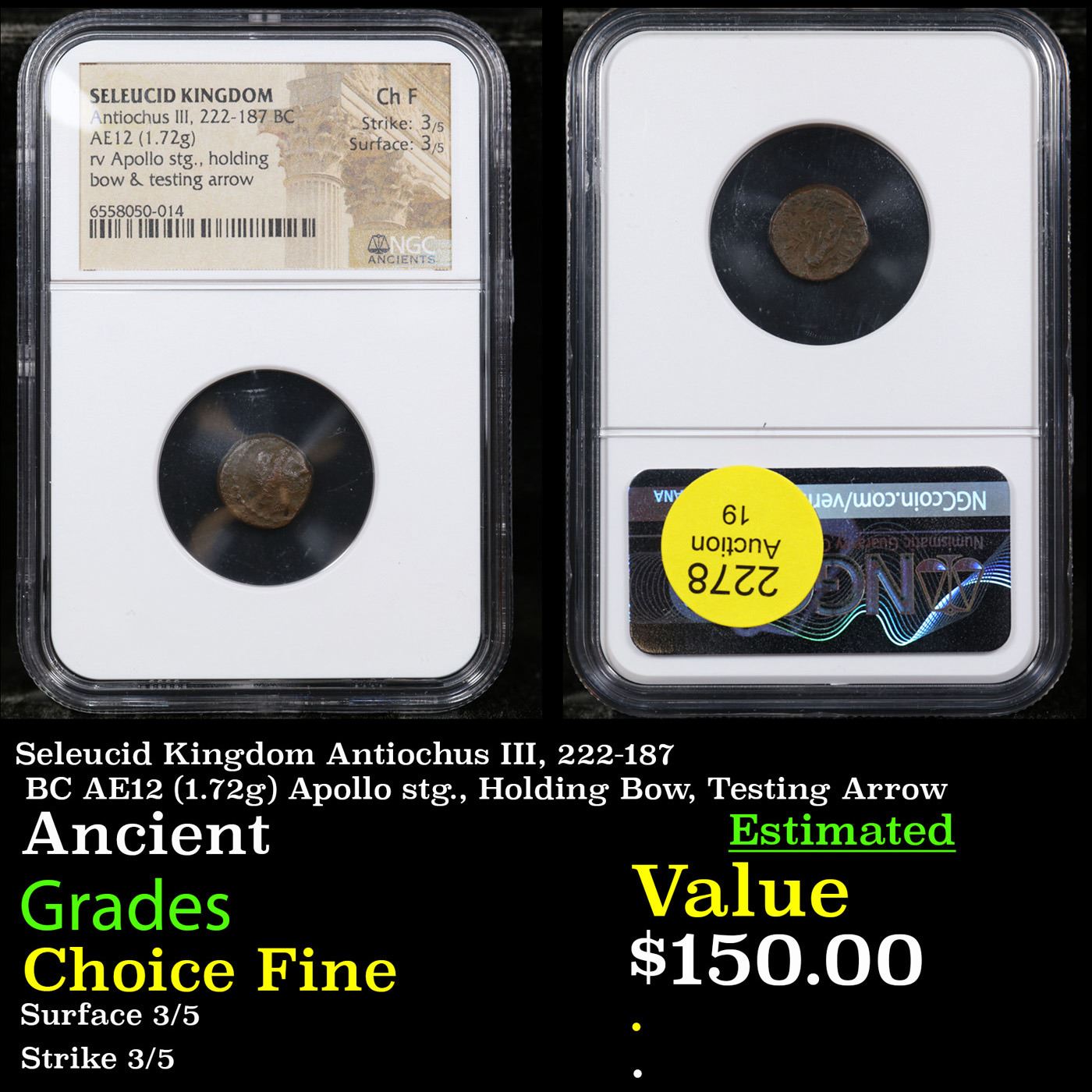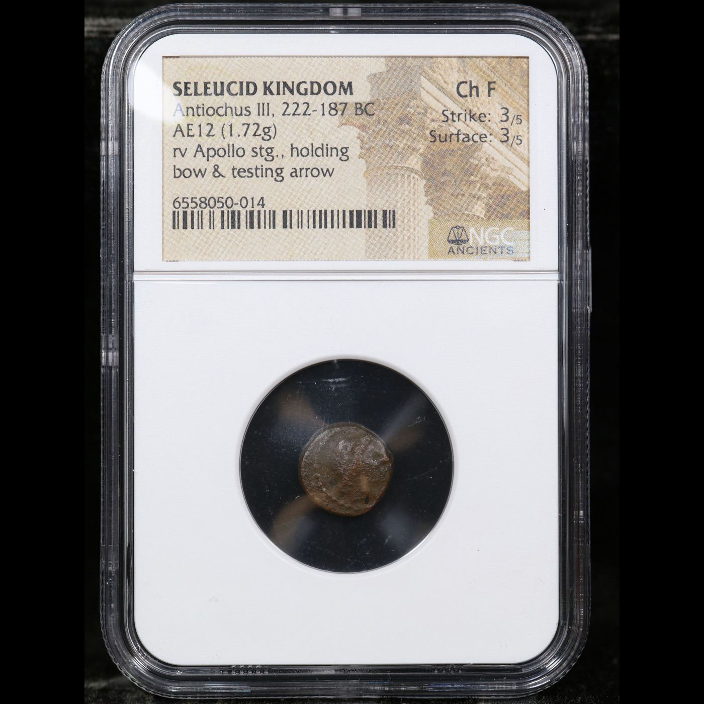 NGC Seleucid Kingdom Antiochus III, 222-187 BC AE12 (1.72g) Apollo stg., Holding Bow, Testing Arrow Graded Choice Fine By NGC. The Slabbing Alone Costs $50 A Key Date's Pick