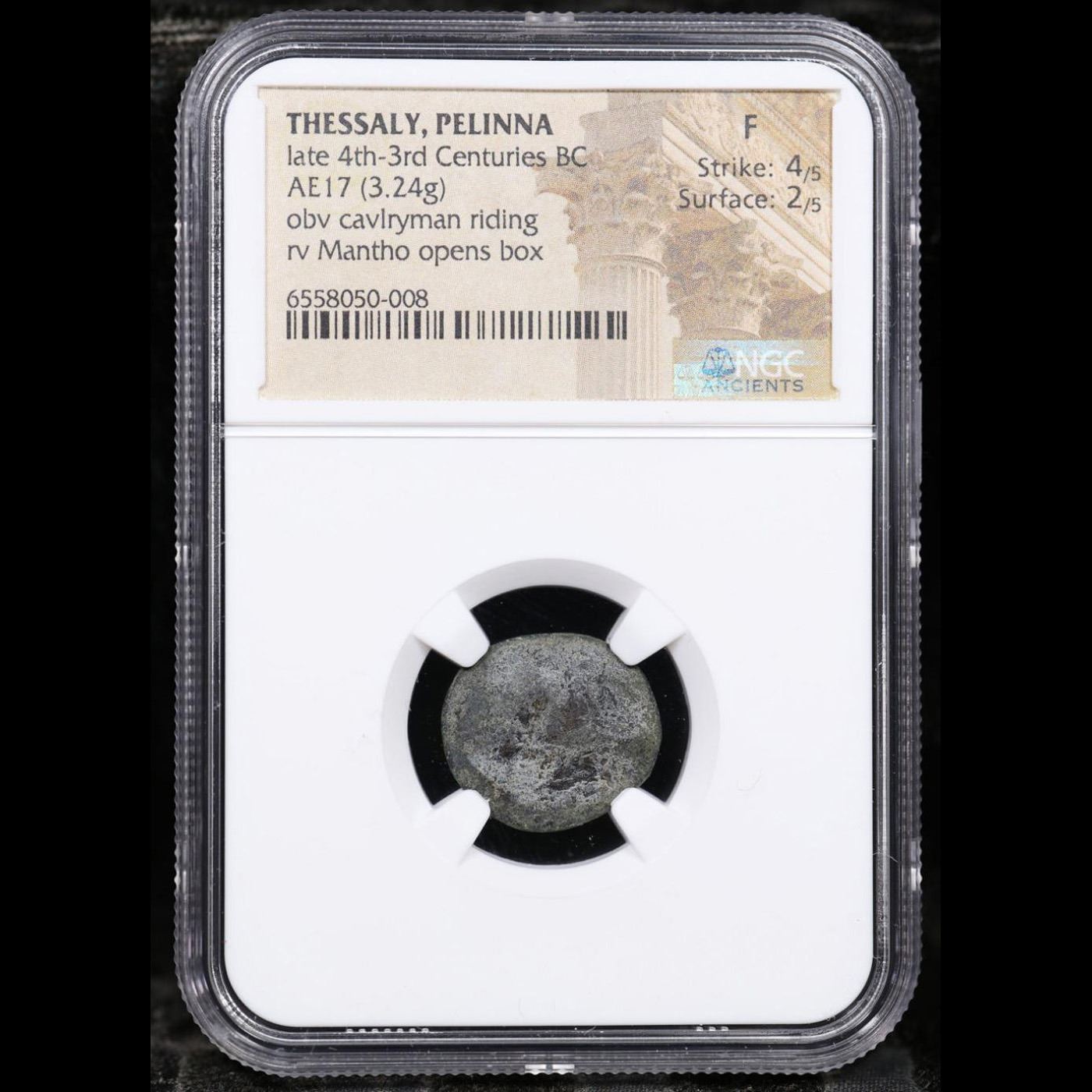 NGC Thessaly, Pelinna late 4th-3rd Centuries BC AE17 (3.24g) obv cavlryman riding rv Mantho opens box Graded Fine By NGC. The Cost Of Slabbing Alone is $50 A Key Date's Pick