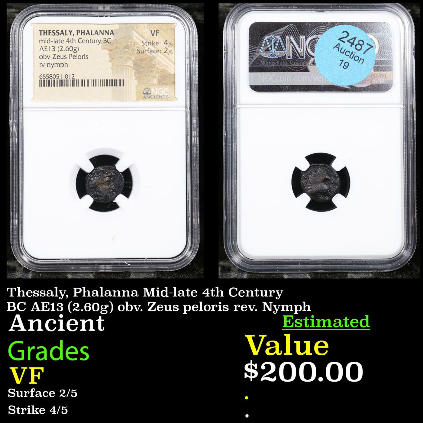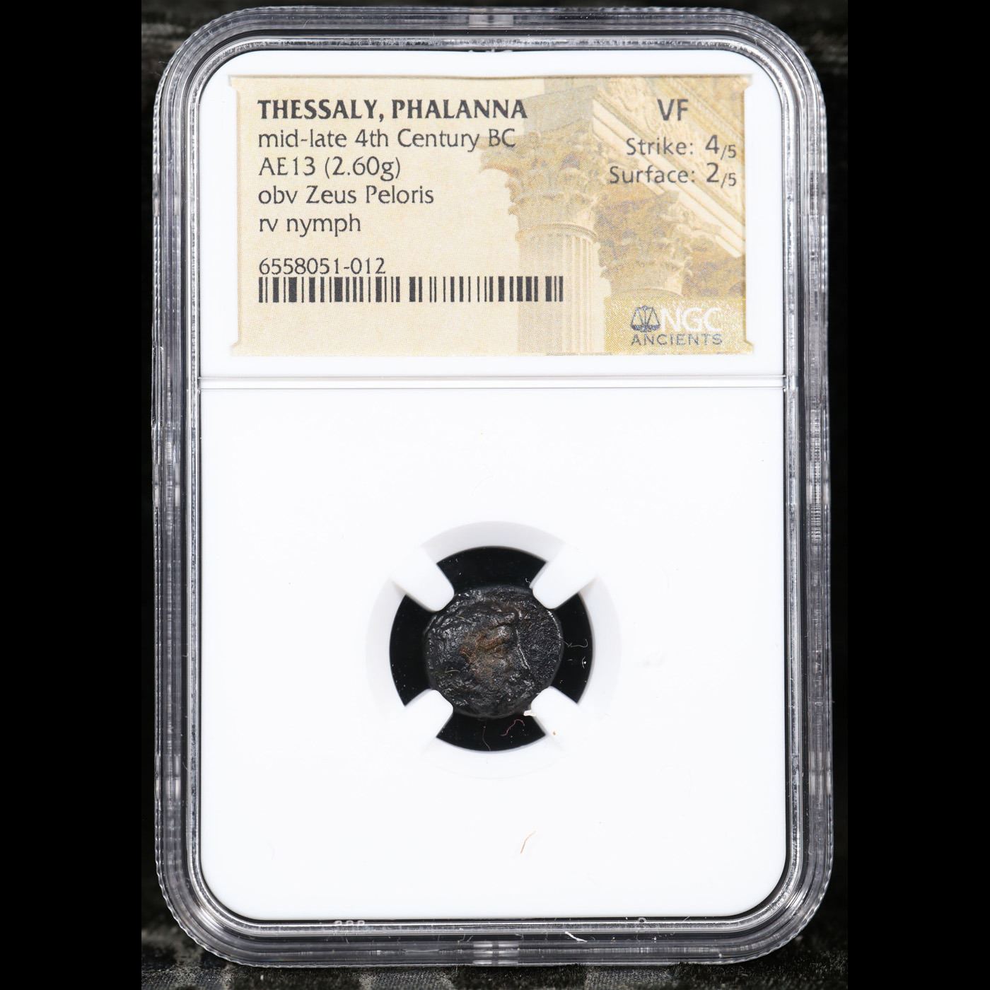 NGC Thessaly, Phalanna Mid-late 4th Century BC AE13 (2.60g) obv. Zeus peloris rev. Nymph Graded VF By NGC. The Slabbing Alone Costs $50 A Key Date's Pick
