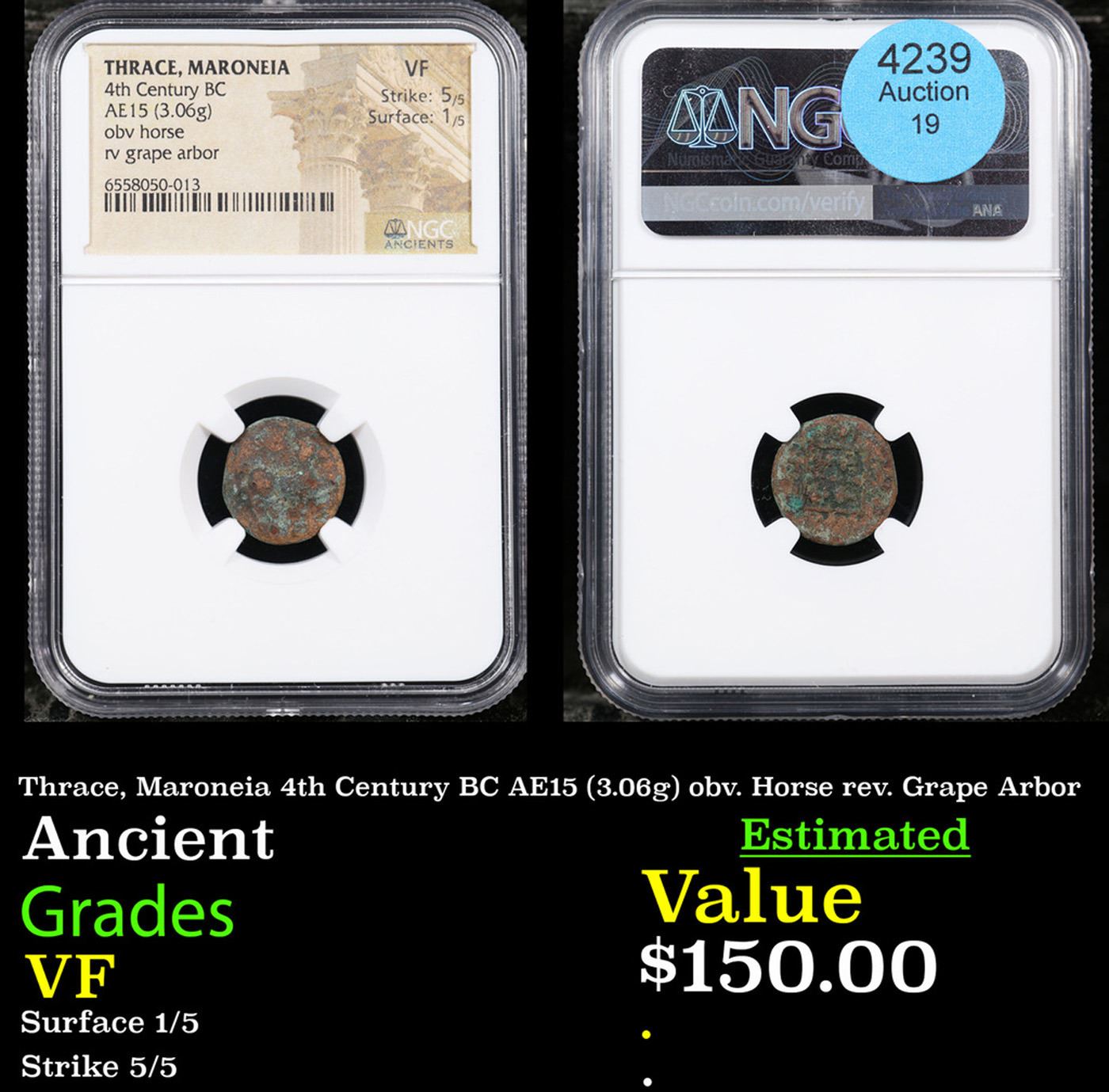 NGC Thrace, Maroneia 4th Century BC AE15 (3.06g) obv. Horse rev. Grape Arbor Graded VF By NGC. The Slabbing Alone Costs $50 A Key Date's Pick