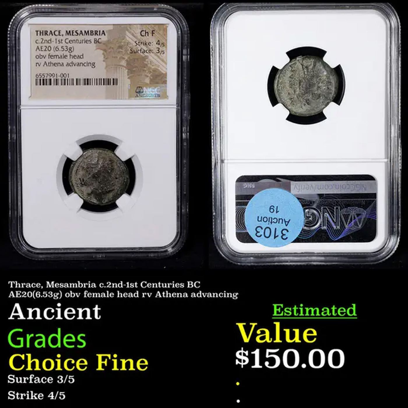 NGC Thrace, Mesambria c.2nd-1st Centuries BC AE20(6.53g) obv female head rv Athena advancing Graded Choice Fine By NGC.