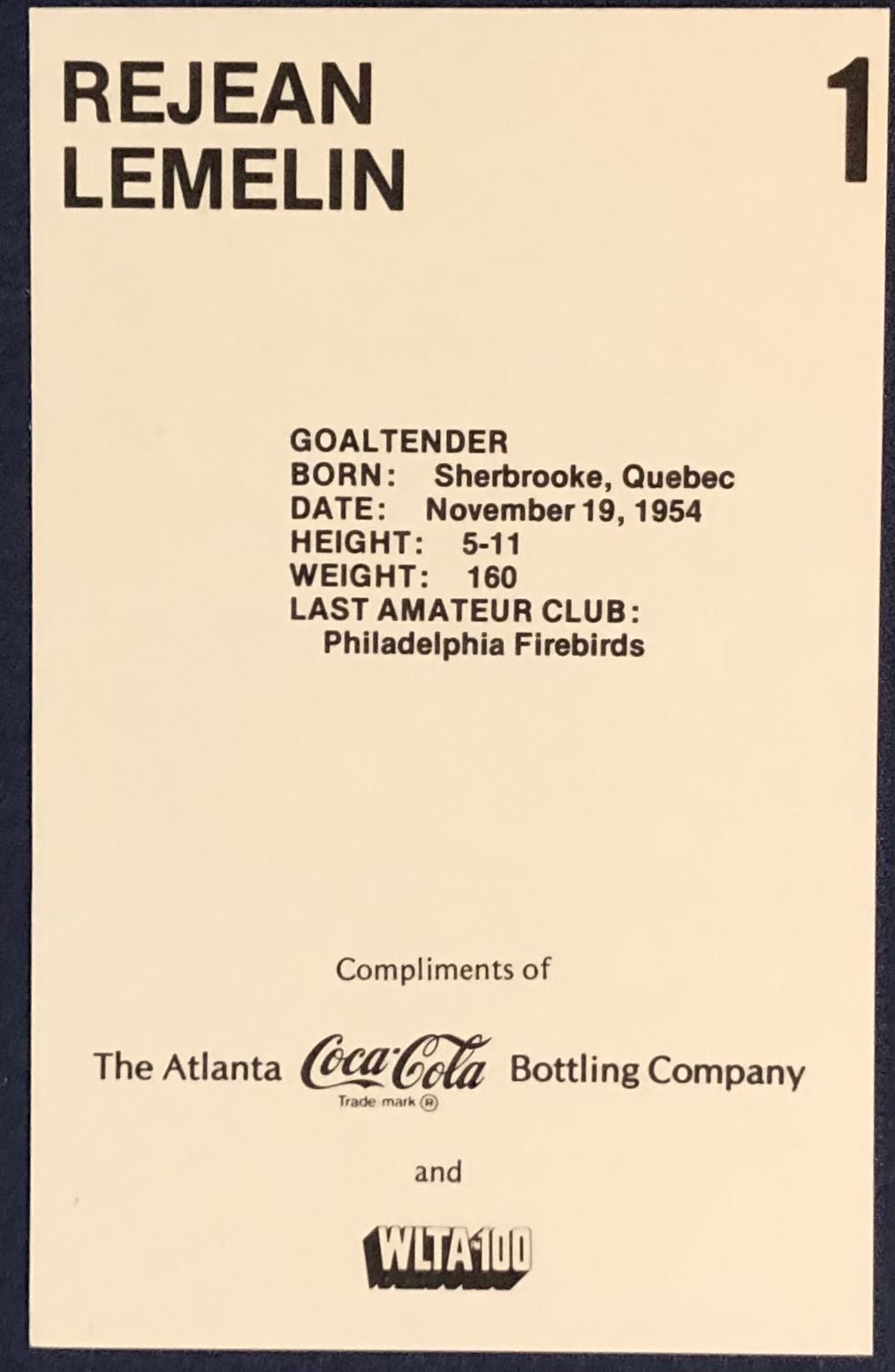 NHL ATLANTA FLAMES 3.5"x5.5" POSTCARD - REJEAN LEMELIN