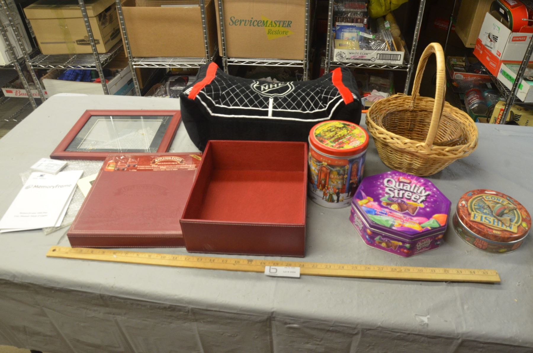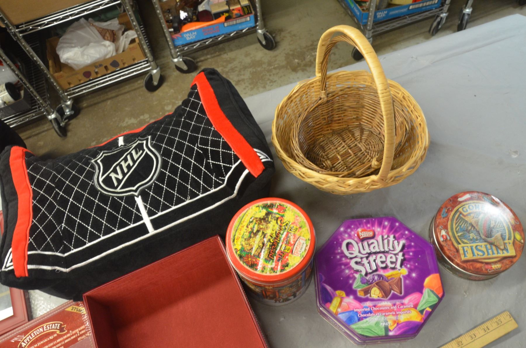 NHL Pillow, Appleton Collectors Box, Wicker Baskets and Tins