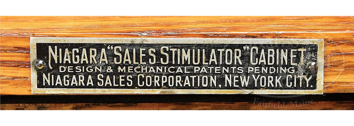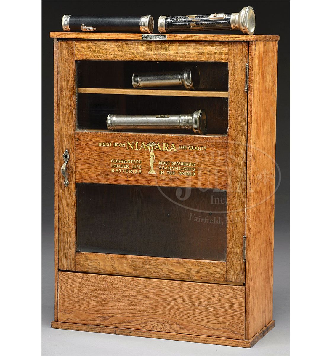 Oak display cabinet has a hinged front door with glass viewing panels and original decal. Bottom drawer contains four early Niagara flashlights. Manufacturer's tag reads: "Niagara "Sales Stimulator" Cabinet, Niagara Sales Corporation, New York City". SIZE: 20-1/2" w x 29" t x 9" d. CONDITION: Good; interior wood battery storage dividers missing; replaced shelf and bulb storage drawer; metal battery testing assembly missing. 1-13209