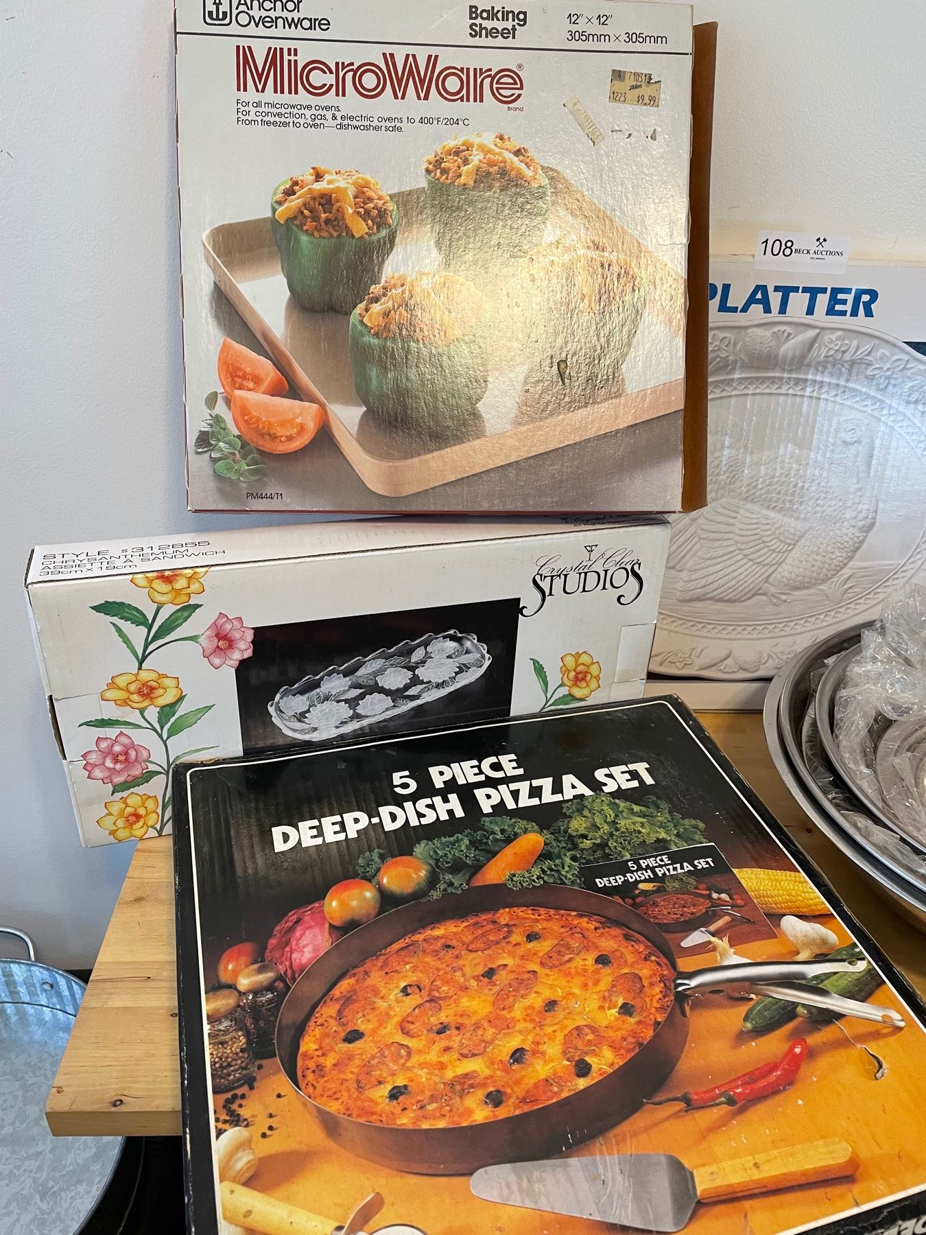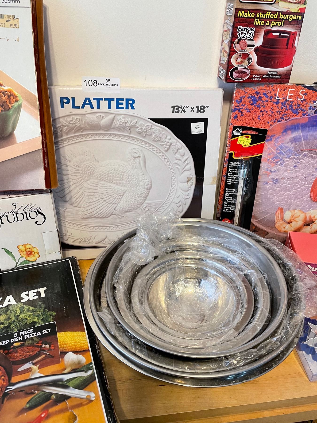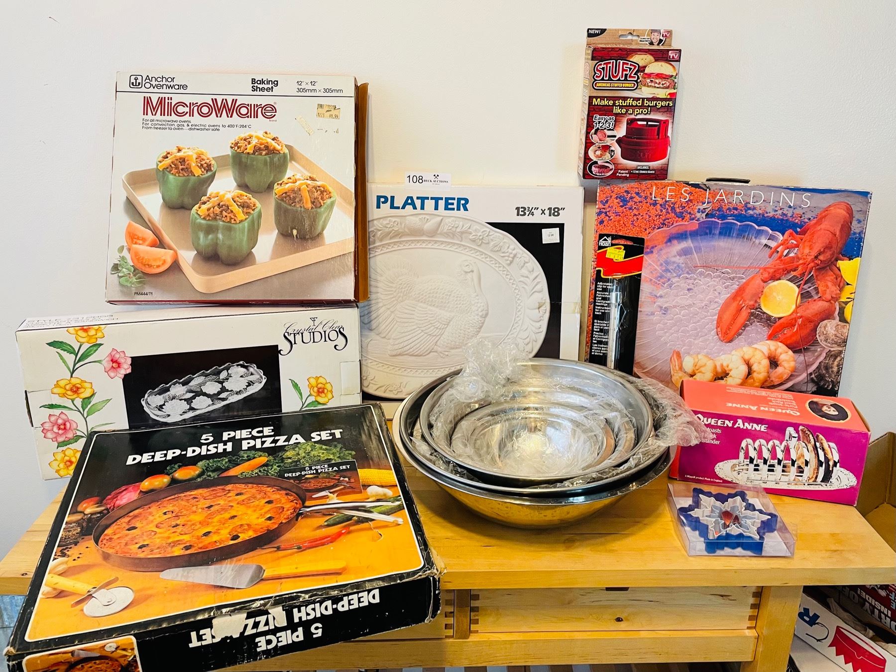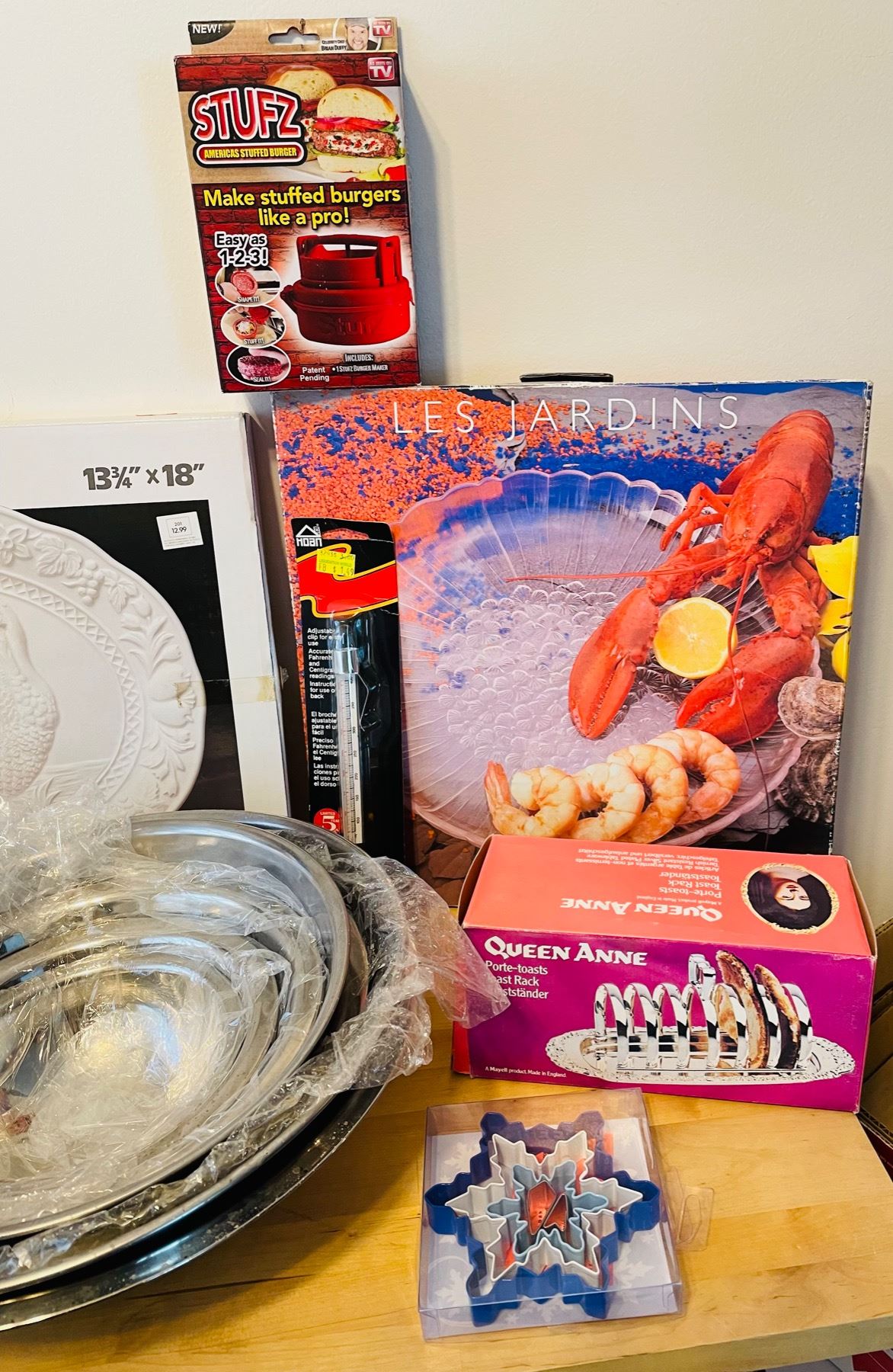 Includes a ceramic turkey platter, seafood platter, burger stuffer, deep dish pizza set, etc.