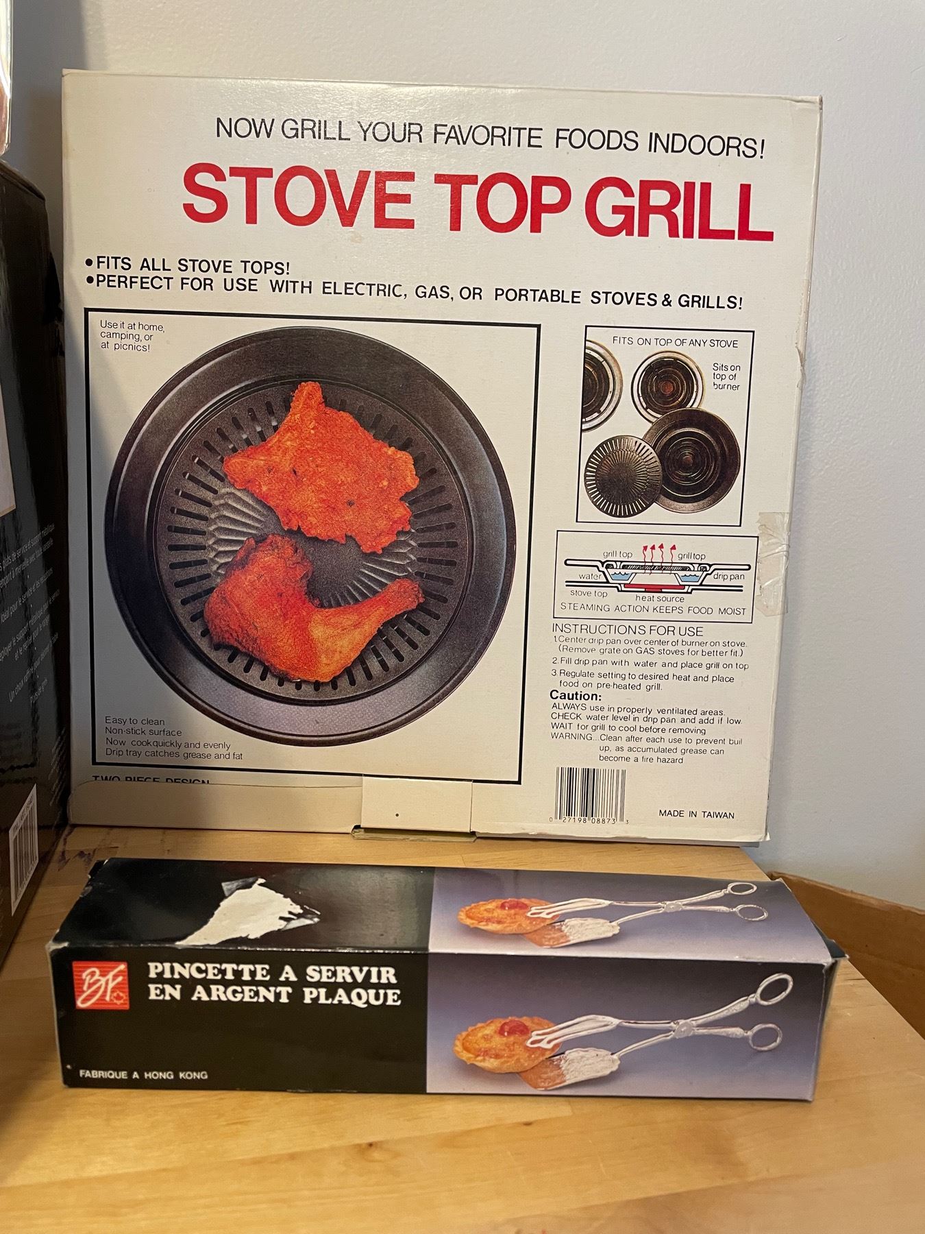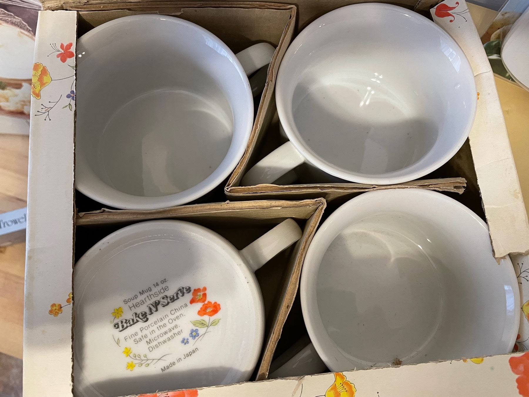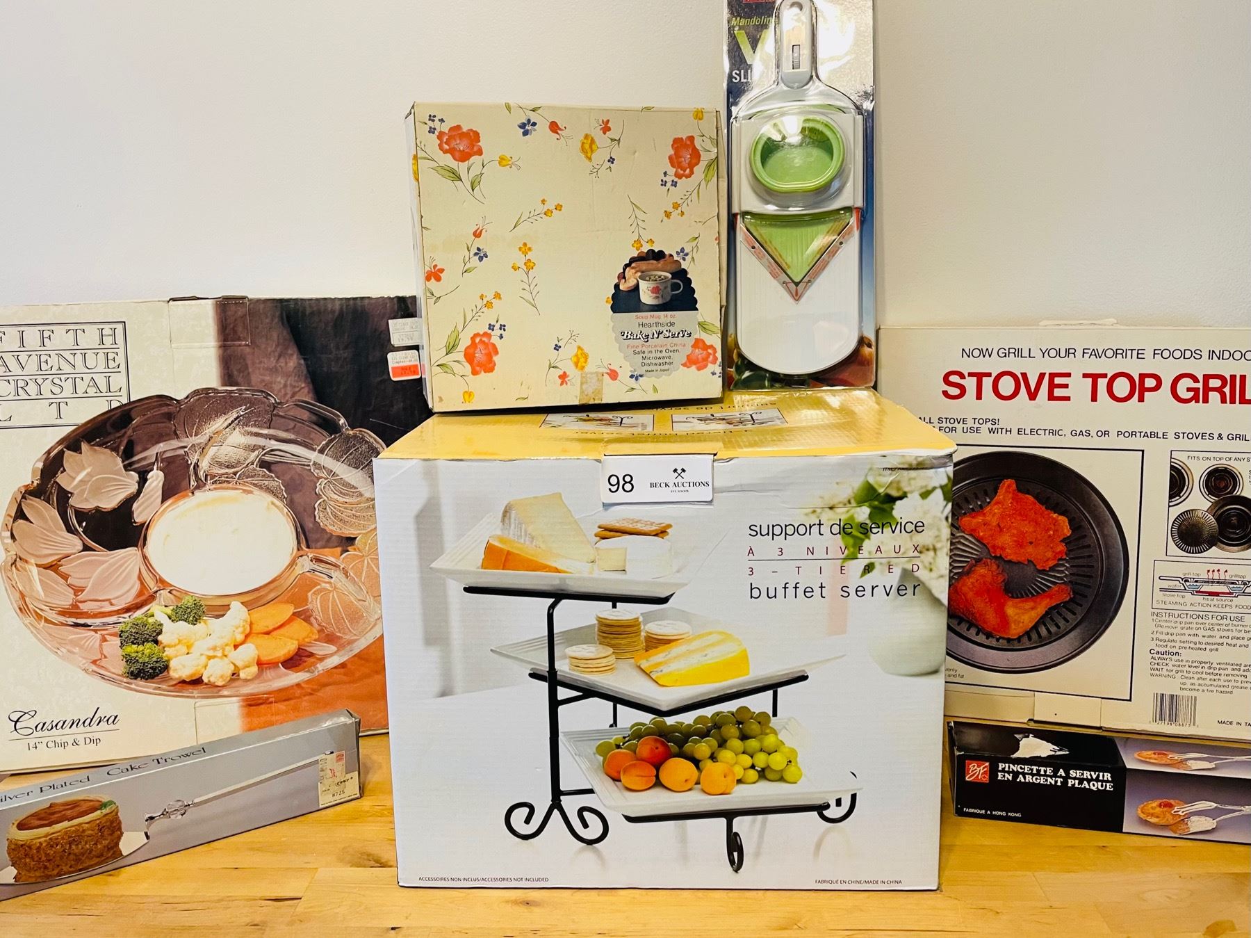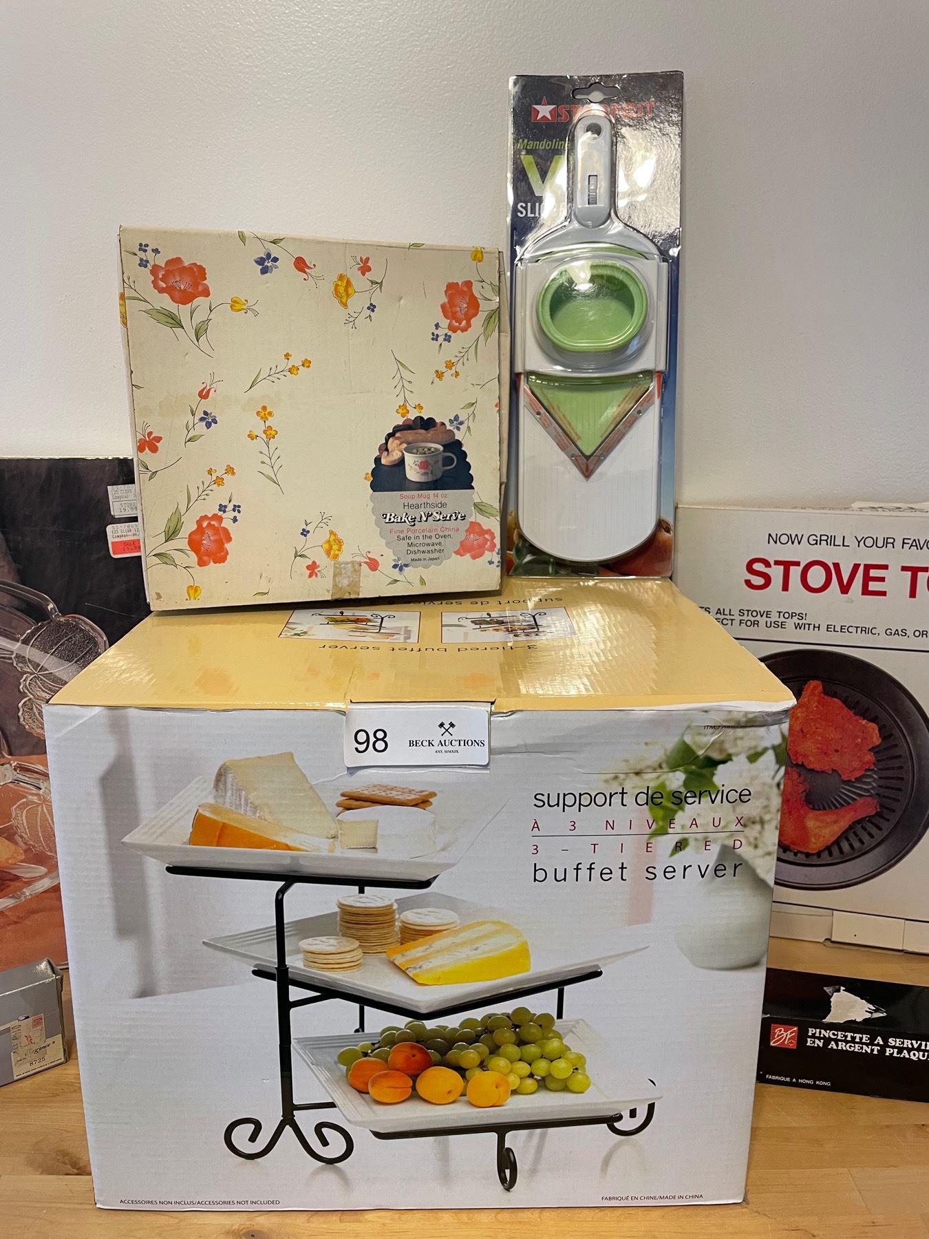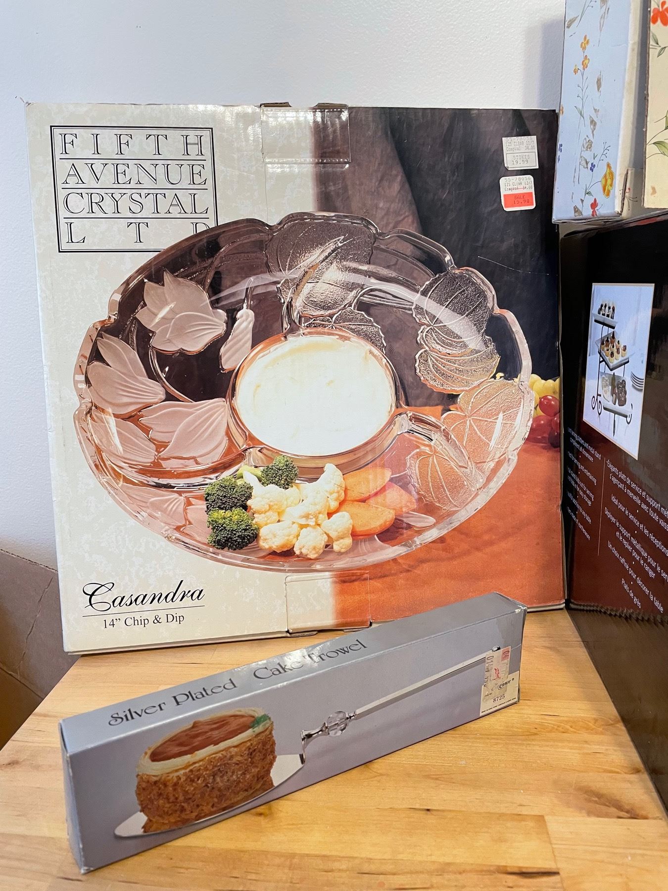 Includes New Old Stock vintage soup mugs, tiered buffet server, crystal platter, tongs and cake trowel.