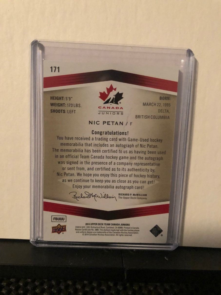 NIC PETAN 2014 UD TEAM CANADA JUNIORS JERSEY CARD & AUTOGRAPH 052/199