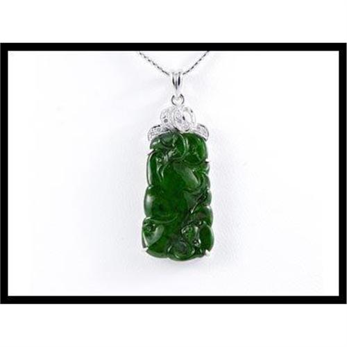 This lovely pendant is elegant and stunning. 1 carved green jade is set with 9 full cut diamonds that weigh .06 carats TW.