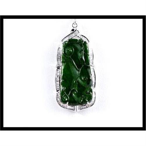 This lovely pendant is elegant and stunning. 1 carved green jade is surrounded by 73 taper beget diamonds that weigh .64 carats TW.