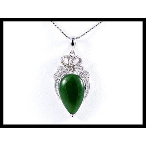 This jade pendant brings elegance and charm to any outfit. Set in 18K white gold, the pendant features 1 pear shaped green jade, 23 full cut diamonds that weigh .10 carats and 39 taper beget diamonds that weigh .18 carats TW.
