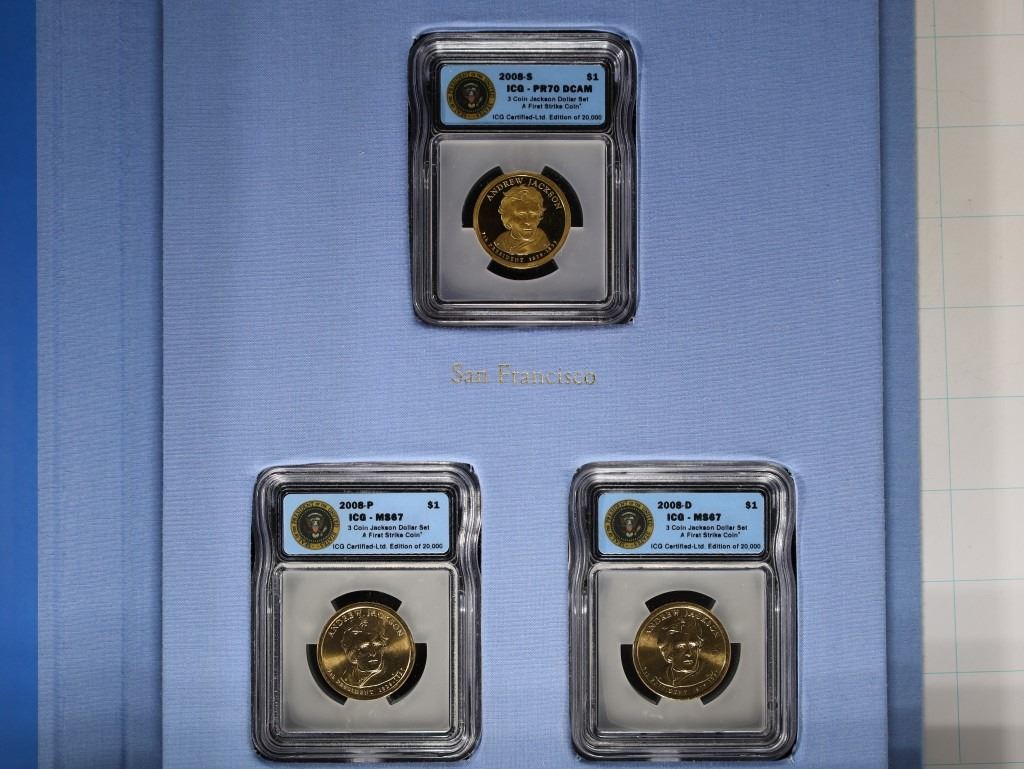 ALL ICG GRADED: 2008-S IS PR70 DCAM FIRST STRIKE, 2008-P MS67 FIRST STRIKE AND 2008-D MS67 FIRST STRIKE. NICE BLUE FOLIO FROM THE CABLE SHOPPING NETWORK