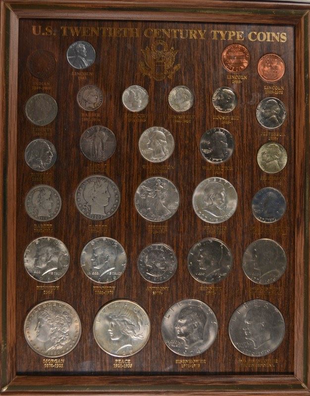 SET INCLUDES: 1905 LINCOLN CENT XF, 1916 BARBER DIME VF, 1883 LIBERTY "V" NICKEL XF, 1930-S QUARTER VF. 1936 BUFFALO NICKEL AU, 1909 BARBER HALF DOLLAR F-VF, 1886 MORGAN DOLLAR BU, 1925 PEACE DOLLAR BU, 1944 WALKING LIBERTY HALF DOLLAR AU & 1953-D FRANKLIN HALF DOLLAR BU ( 30 ) COINS TOTAL ESTIMATE, $300.00 TO $350.00