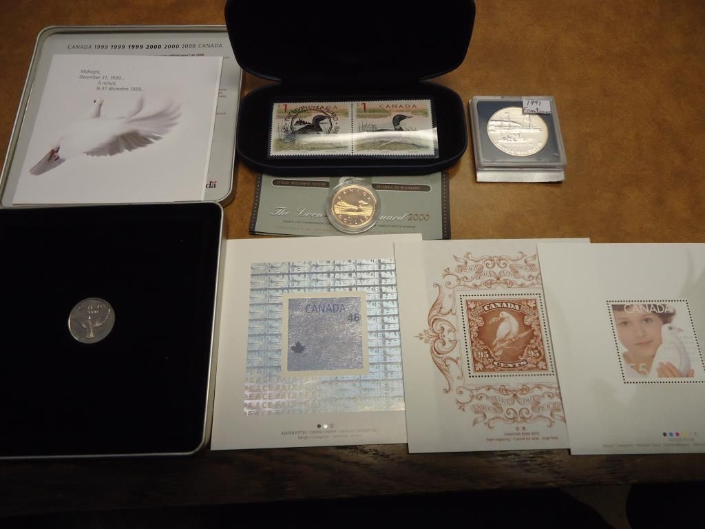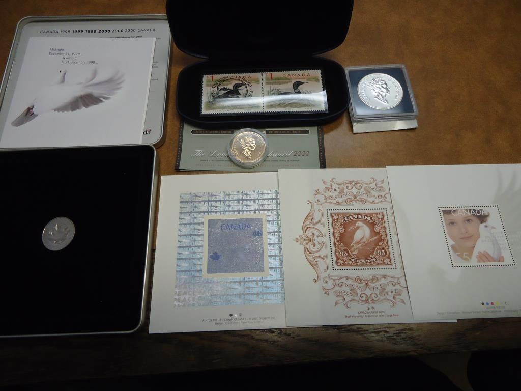 1991 CANADA FRONTENAC SILVER DOLLAR PROOF .3750 OZ. ASW, 2000 LOONIE COIN AND STAMP SET AND 2000 MILLENNIUM WELCOME SET INCLUDES: DOVE COIN HOLOGRAM AND TWO POSTAGE STAMPS. ALL IN ORIGINAL ROYAL CANADIAN MINT PACKAGING