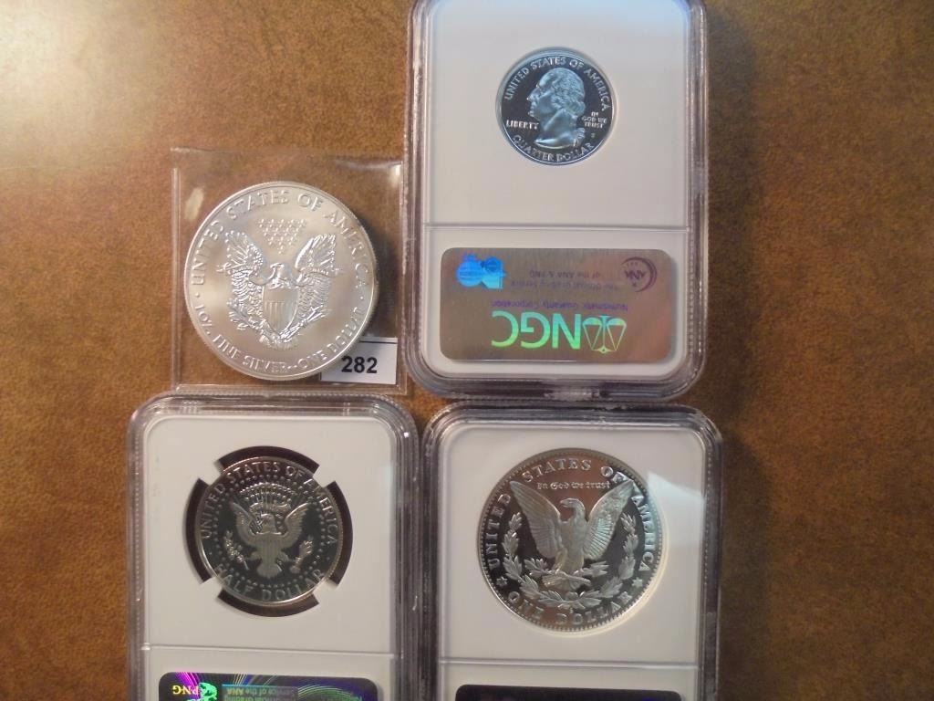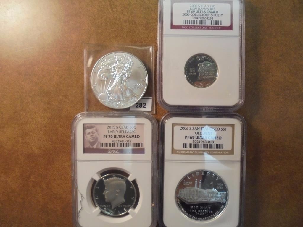 2015 AMERICAN SILVER EAGLE UNC, 2000-S NEW HAMPSHIRE QUARTER NGC PF69 ULTRA CAMEO, 2015-S KENNEDY HALF DOLLAR NGC PF70 ULTRA CAMEO EARLY RELEASES SLAB IS CRACKED AND 2006-S OLD MINT SILVER DOLLAR NGC PF69 ULTRA