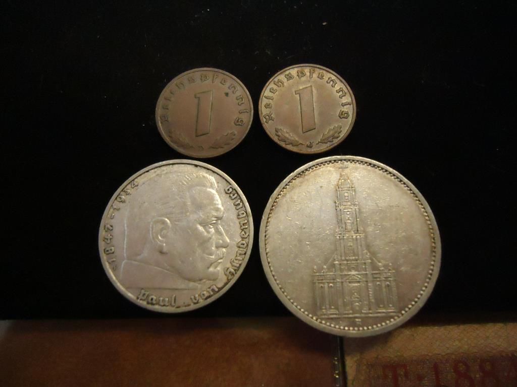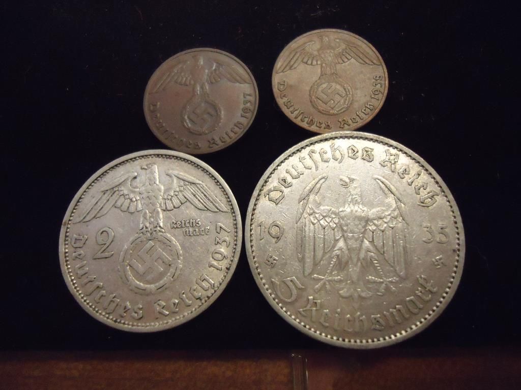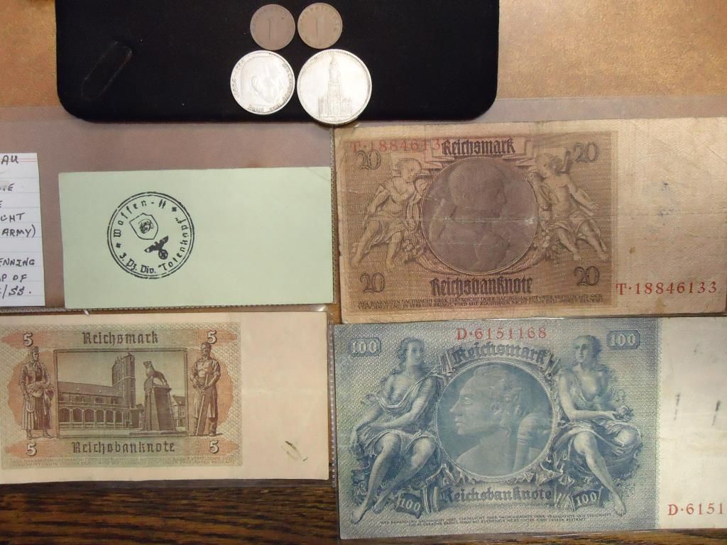 1935-100 MARK WAR TIME NOTE VERY FINE (SCARCE), 1929 20 MARK WITH AN SS STAMP ON IT , 1942 5 MARK VF-EF, WWII 10 PFENNIG WITH AN SS STAMP ON IT, 1937 & 1938 PFENNIGS, 1935 SILVER 5 MARK AND 1938 SILVER 2 MARK