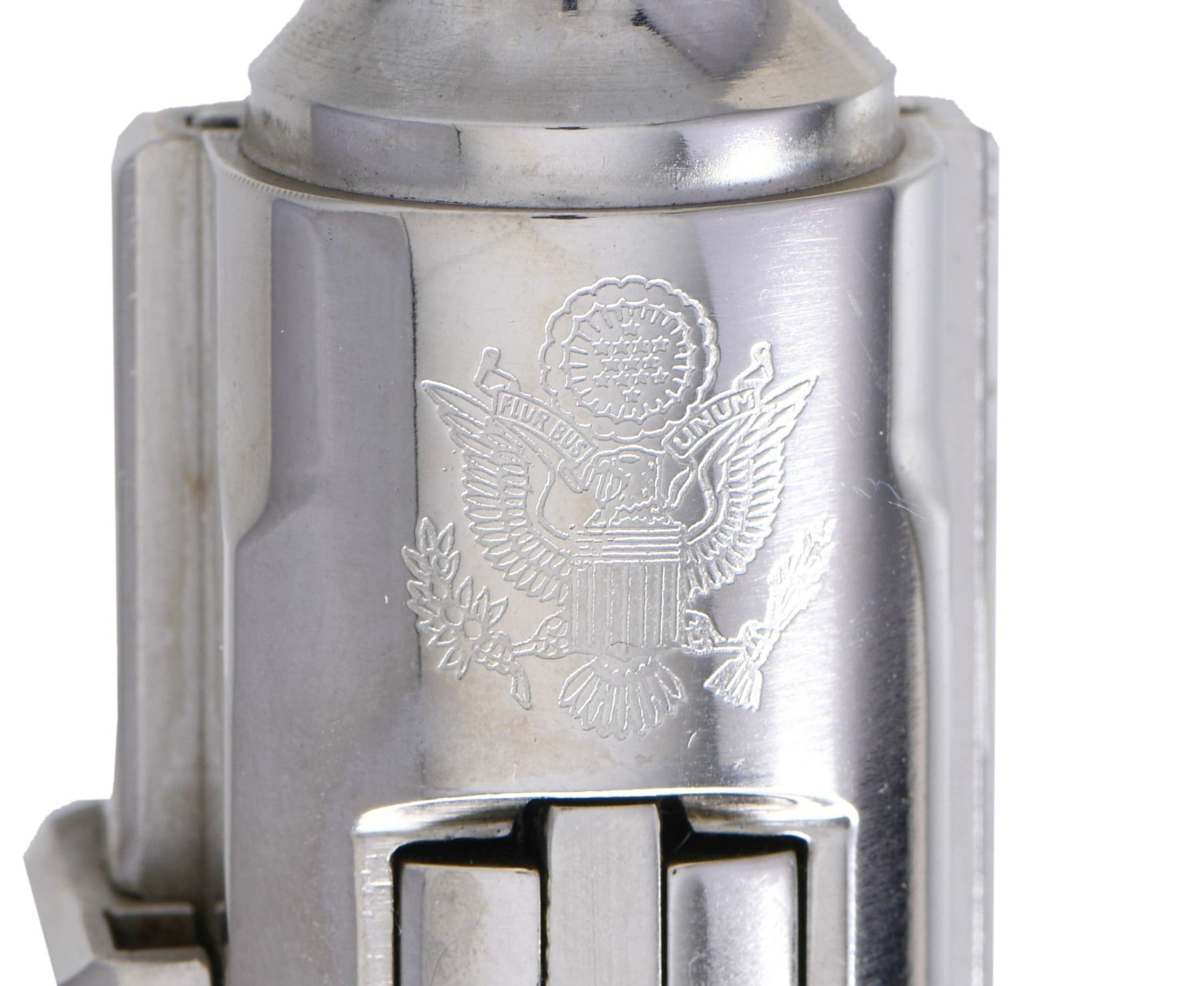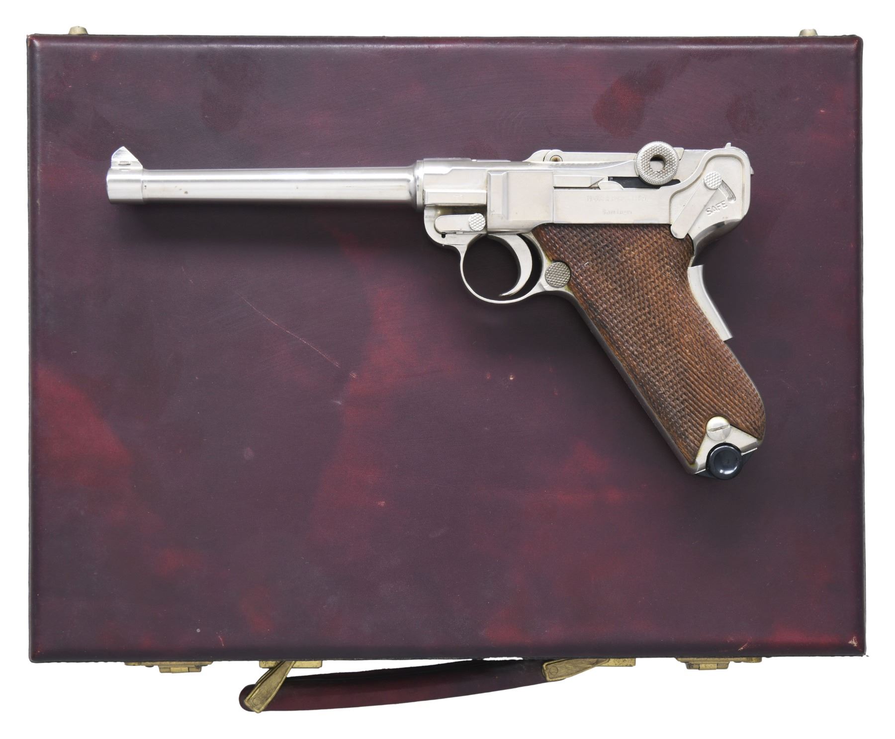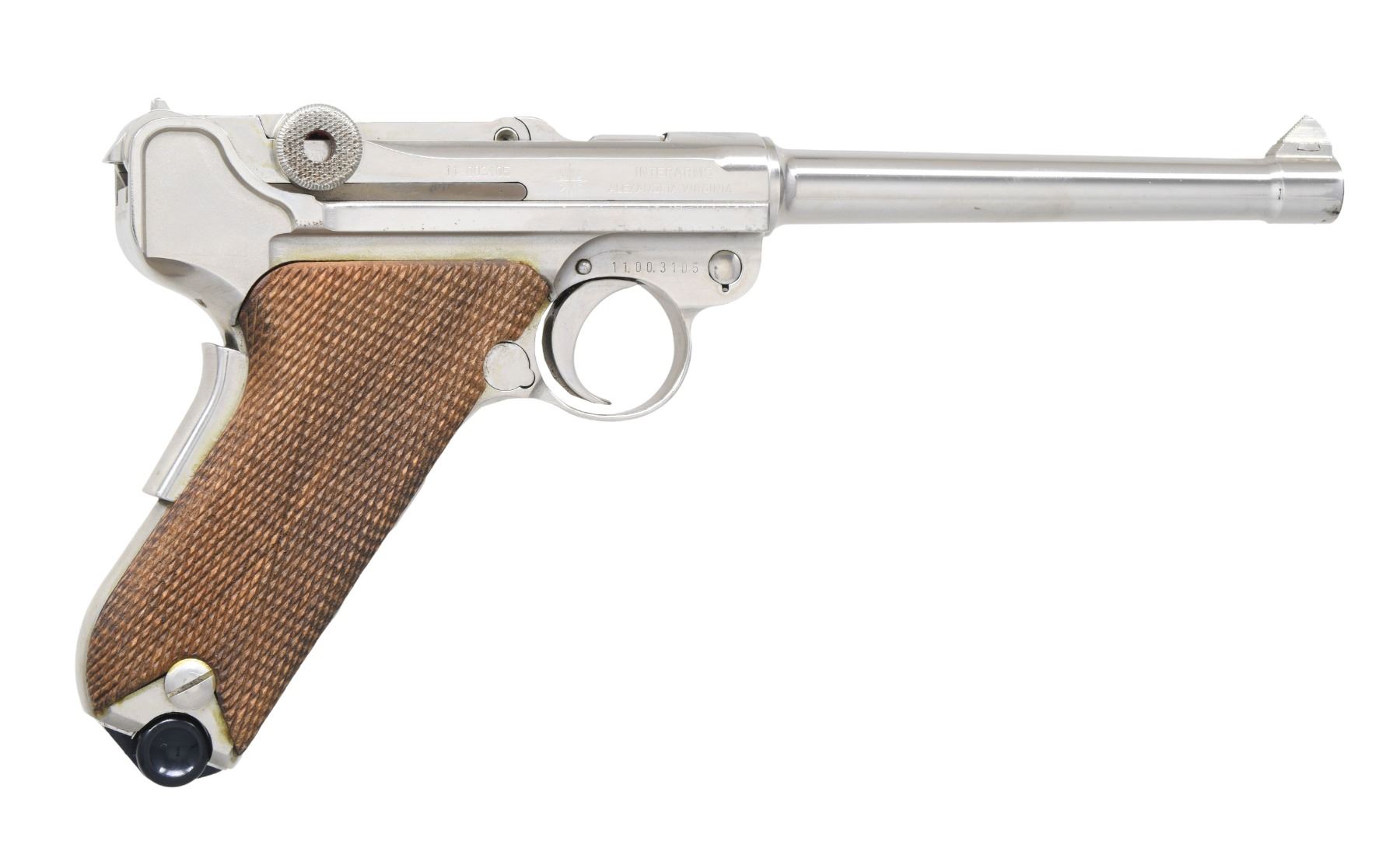 LUGER SEMI-AUTOMATIC PISTOL WITH FACTORY DISPLAY CASE. Cal. 9mm Luger. S# 11.00.3105. Bbl. 6". American Eagle Luger mfg. by Mauser and imported by Interarms. The bbl. extension is marked with the Great Seal of the United States over the top of the chamber, with the S#, followed by Interarms' importer information marked on the right. Toggle is marked with the Original Mauser logo. Frame and bbl. exhibit standard markings. Metal components exhibit a chrome plated finish. Frame is mounted with 2-piece checkered wood grips. Dovetailed serrated blade front sight, with fixed U-notch rear sight. All numbers are matching and are present on the frame and bbl. extension. MAGS: 1 chrome plated 8-rd., with black plastic bottom. UNATTACHED ACCESSORIES: black leather factory display case, featuring a red velvet lining, containing a 1972 Interarms' sales catalog, as well as an original factory manual. CONDITION: very good, with metal components retaining the vast majority of their chrome plated finish, exhibiting some scattered spots of light surface oxidation and pitting overall. Brilliant mirror bore, exhibiting some grease in the grooves, while retaining well defined rifling throughout. Grips are very good, showing some light smoothing. Case is very good, exhibiting some light exterior wear. (25-1264/MLW). MODERN. $1,000-1,500.