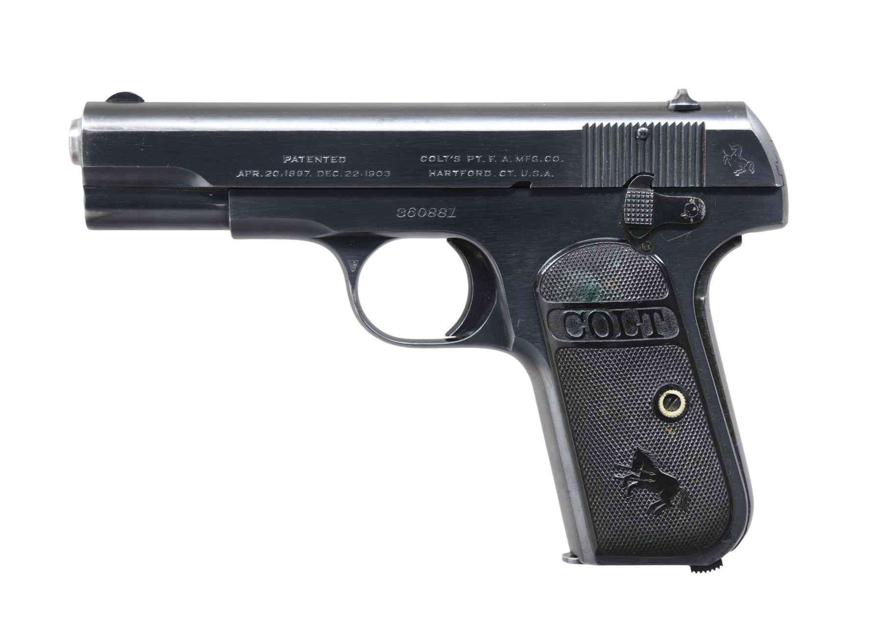 PISTOL. Cal. 32 ACP. S# 360881. Bbl. 3 3/4". Model 1903 Hammerless semi-automatic pistol mfg. by Colt in 1920. Left side of the slide and marked with Colt's patent and mfg. information, followed by the Rampant Colt logo, with the cal. designation marked on the right. Left side of the frame is marked with the S# and "VP" proof. Metal components exhibit a blue finish overall, save for on the bbl., which is polished in-the-white. Frame is mounted with 2-piece Colt checkered black hard rubber grips. Half-moon blade front sight with U-notch rear sight. Slide is matching to the frame via the full S# on the interior. MAGS: One 2-tone 8-rd. CONDITION: Very good, with metal components retaining the majority of their original factory blue finish, exhibiting some spots of light to mild wear and thinning, a few scattered superficial handling marks, as well as some spots of light surface oxidation overall. Bore is bright, exhibiting dark oxidation, while retaining well-defined rifling throughout. Grips show some smoothing, as well as some scattered nicks and marks from handling and storage, but otherwise remain sturdy and serviceable. (24-7205/MLW). CURIO. $300-500.