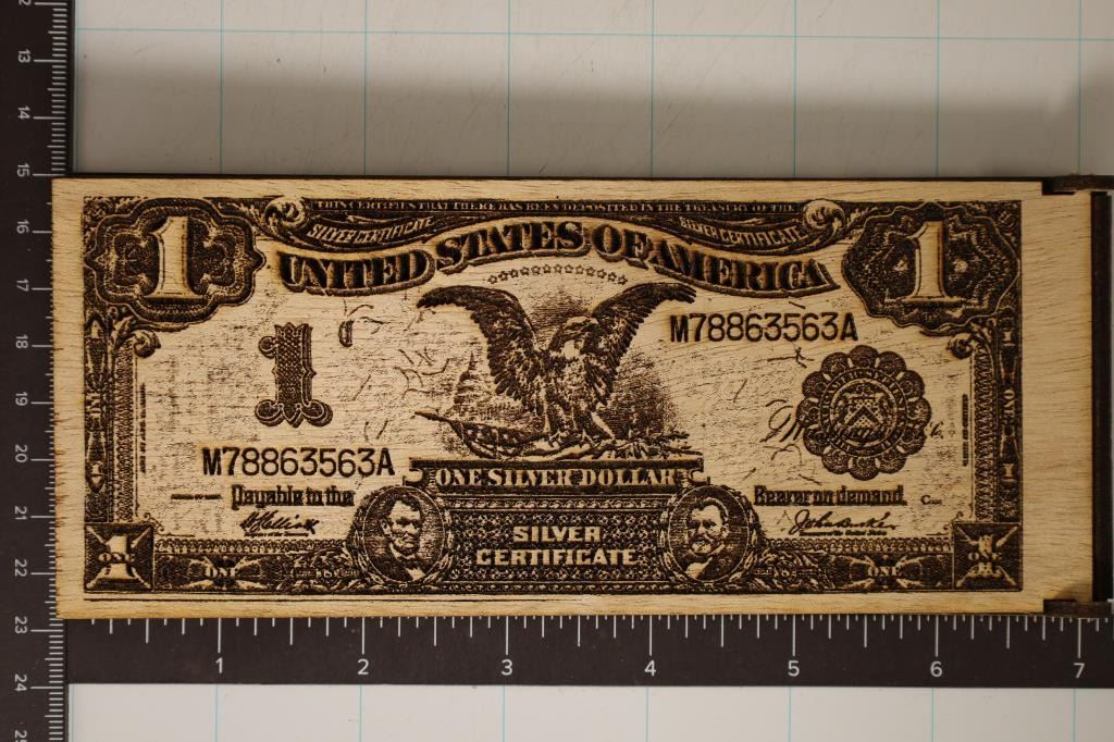 FLIP LID. 7" X 3" X 1/2", HAS THE ENGRAVING OF A US BLACK EAGLE $1 SILVER CERTIFICATE