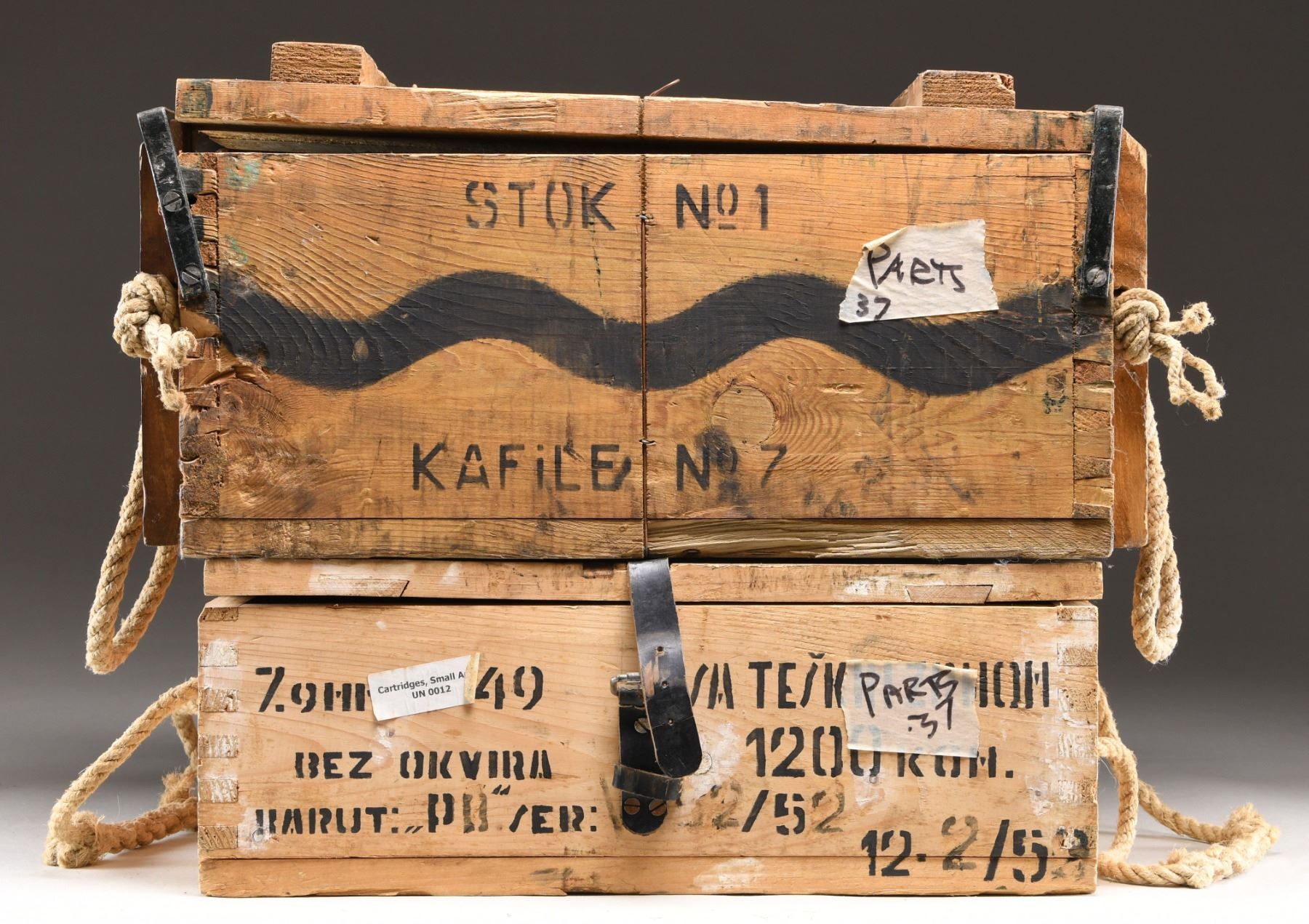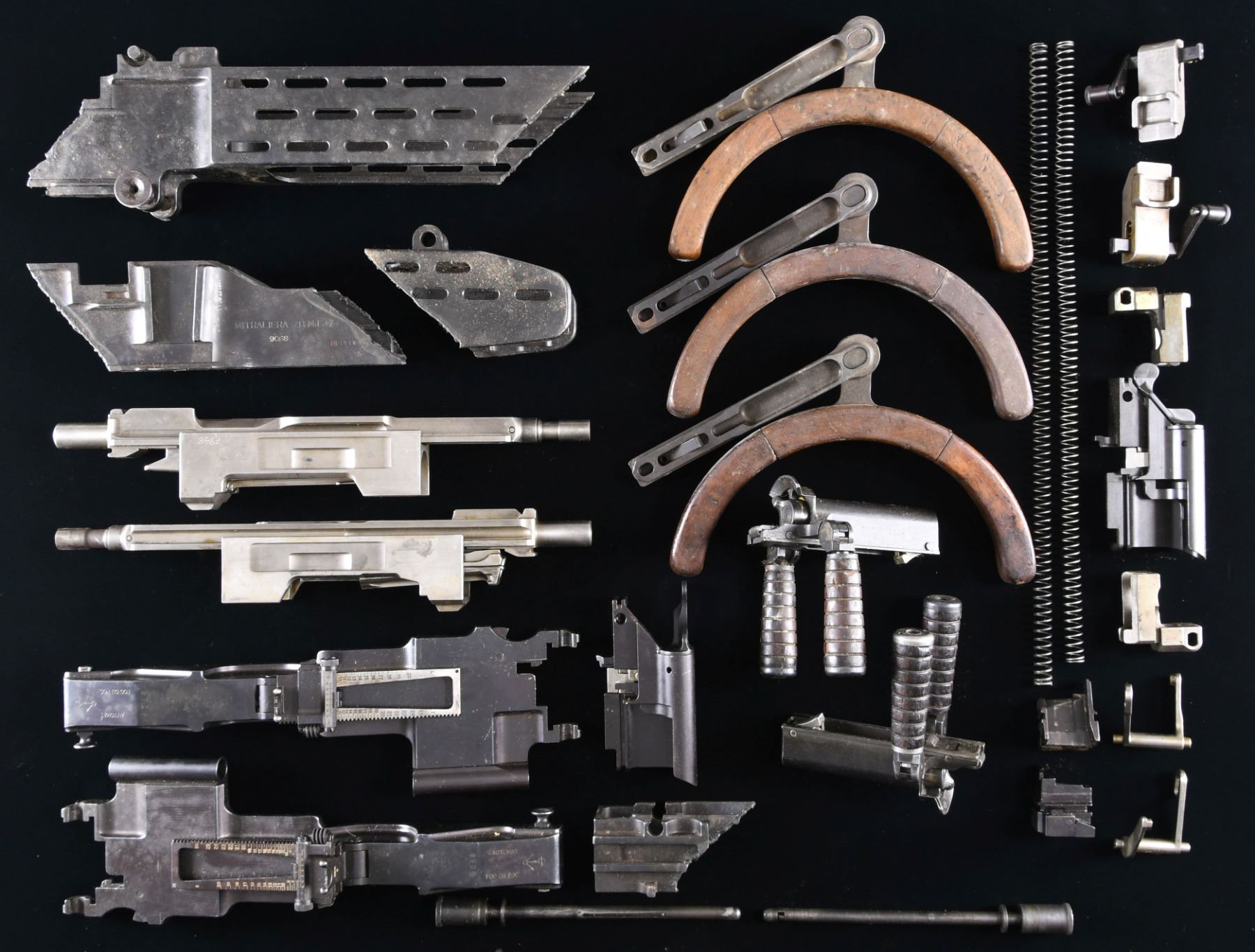 Nice Czech ZB37 machine gun parts kit, including: 1 torch cut receiver, 2 receiver top covers, 2 feed trays, 2 trigger assemblies, 2 complete bolt assemblies (bolt, bolt carrier, and piston), 3 detachable shoulder stocks, as well as several other small parts and components. CONDITION: good, with parts retaining the majority of their original blue finish, exhibiting some areas of wear, as well as some scattered marks from handling and storage. Wood stocks show scattered marks and impressions from handling and storage, but otherwise remain sturdy and serviceable. PROVENANCE: From the Estate of Ivan Lee Shapiro. (02-23501/MLW). $500-1,000.