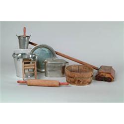 Lot # 336 NICE DOLL RELATED ACCESSORIES LOT. Consisting of seven pieces. Miniature marked Bissell's midget sweeper. Little wooden wash tub, rolling pin, miniature oval canner, some pails, a ringer, etc. SIZE: Oval tin canner is approx. 7". CONDITION: Generally good. 1-28669 (200-400)