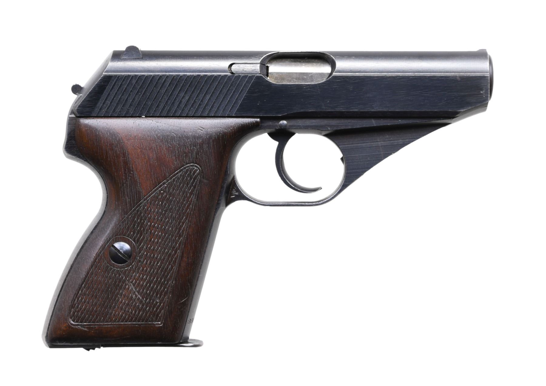 SEMI-AUTOMATIC PISTOL WITH HOLSTER. Cal. 7.65mm. S# 896834. Bbl. 3 1/4". Model HSc semi-automatic pistol mfg. by Mauser. Left side of the slide is marked with the Mauser banner logo, followed by markings stipulating Mauser's mfg. information, as well as the model and cal. designations. Left side of the frame is marked with a German police Eagle/L proof on the rear trigger guard web, with a German Eagle/N (also marked on the right side of the slide) commercial nitro proof marked on the right side of the rear trigger guard web. Metal components exhibit a salt blue finish overall. Frame is mounted with 2-piece flat checkered wood grips. All serialized parts are matching and include the frame, slide, and bbl. MAGS: 2 7-rd. UNATTACHED ACCESSORIES: brown leather holster marked "SCHAMBACH&Co/ BERLIN/ 1942" above an eagle party insignia. CONDITION: very good, with metal components retaining the majority of their original arsenal salt blue finish, exhibiting some light edge wear, a few superficial handling marks, as well as mild wear and thinning that is present on the rear grip strap. Brilliant mirror bore, retaining well defined rifling throughout. Grips are good, with the right panel exhibiting noticeably more superficial marks and impressions from handling and storage. Holster remains malleable, exhibiting some mild wear, some creasing, as well as some light age related cracking. (24-6796/MLW). CURIO. $500-800.