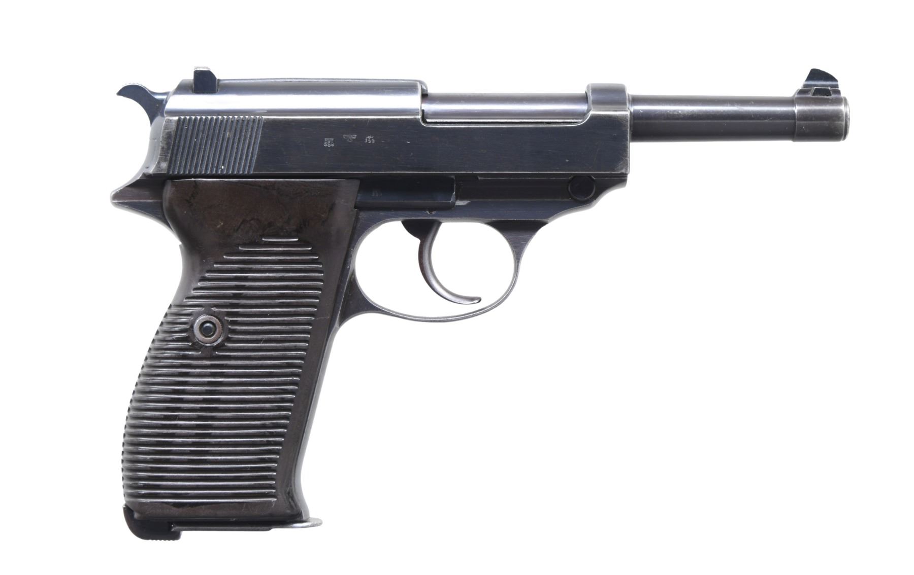 SEMI-AUTOMATIC PISTOL WITH HOLSTER & NUMBERED MAGAZINE. Cal. 9mm Luger. S# 5442e. Bbl. 4 7/8". P.38 semi-automatic pistol mfg. by Walther during the first year of mass production (1941). The left side of the slide is marked "P.38", followed by Walther's mfg. code and the 2-digit year of mfg. "ac/ 41", and the S#, with Walther Eagle/359 proofs and an eagle firing proof marked on the right. Slide stop, trigger, hammer, firing pin cover, and trigger bar exhibit a Walther Eagle/359 proof. Metal components exhibit an attractive early war high polish blue finish overall. Frame is mounted with 2-piece grooved pressed resin grips. Dovetailed blade front sight, with U-notch rear sight. All serialized parts are matching and include the frame, slide, bbl., and locking block. MAGS: 1 non-matching 8-rd. (S# 995j). UNATTACHED ACCESSORIES: black leather holster marked "hjg/ 1941" (Kimnach & Brunn, Kaiserslautern) and with an Eagle/WaA416 proof on the rear. CONDITION: very good, with metal components retaining the majority of their original high polish blue finish, exhibiting some areas of light to mild wear and thinning that show through to gray patina, a few scattered superficial handling marks, as well as a few scattered spots of of light surface oxidation overall. Near mirror bore, exhibiting some light pitting, while retaining well defined rifling throughout. Slide safety lever decocker functions appropriately when cycled by hand. Grips are very good overall, showing some superficial marks from handling and storage. Holster remains malleable, exhibiting some wear, scattered handling marks, and areas of light to mild age related cracking and crazing overall. (24-6888/MLW). CURIO. $800-1,200.