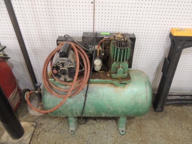 GREAT WORKING AIR COMPRESSOR, COMPLETE WITH GAUGE, BLEEDER VALVE, AND NICE SOLID WORKING HORIZONTAL AIR COMPRESSOR, AS SHOWN. COMPLETE WITH HOSE, ETC.