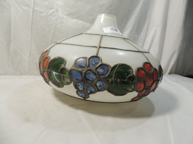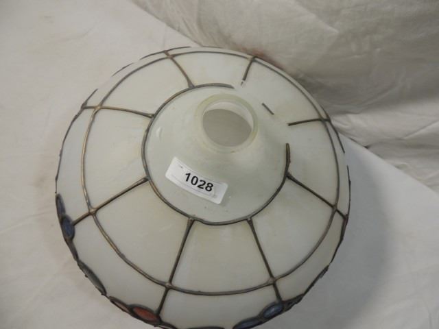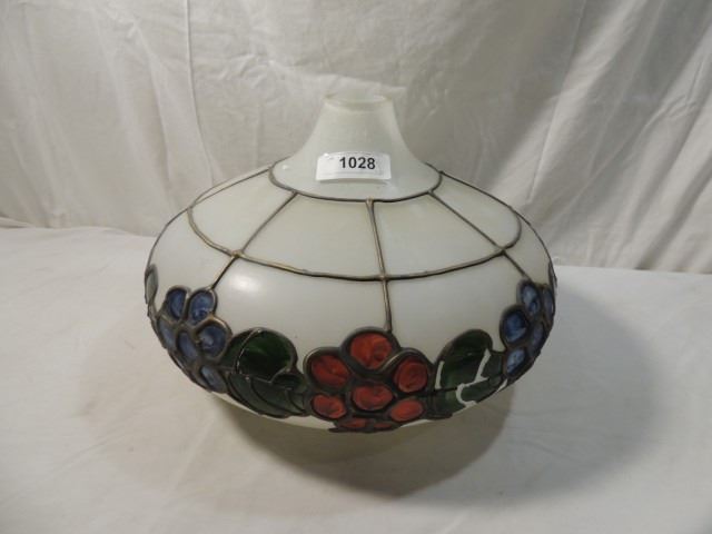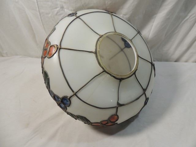 NICE LEADED GLASS VINTAGE LIGHT OR LAMP SHADE. MEASURES 18" ACROSS AND 11" HIGH 5" DIAMETER HOLE ON BOTTOM. NICE, AS SHOWN.