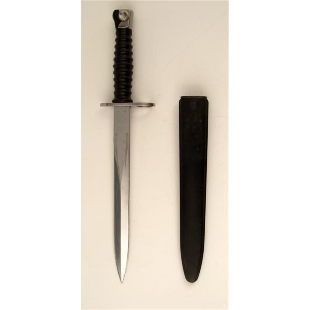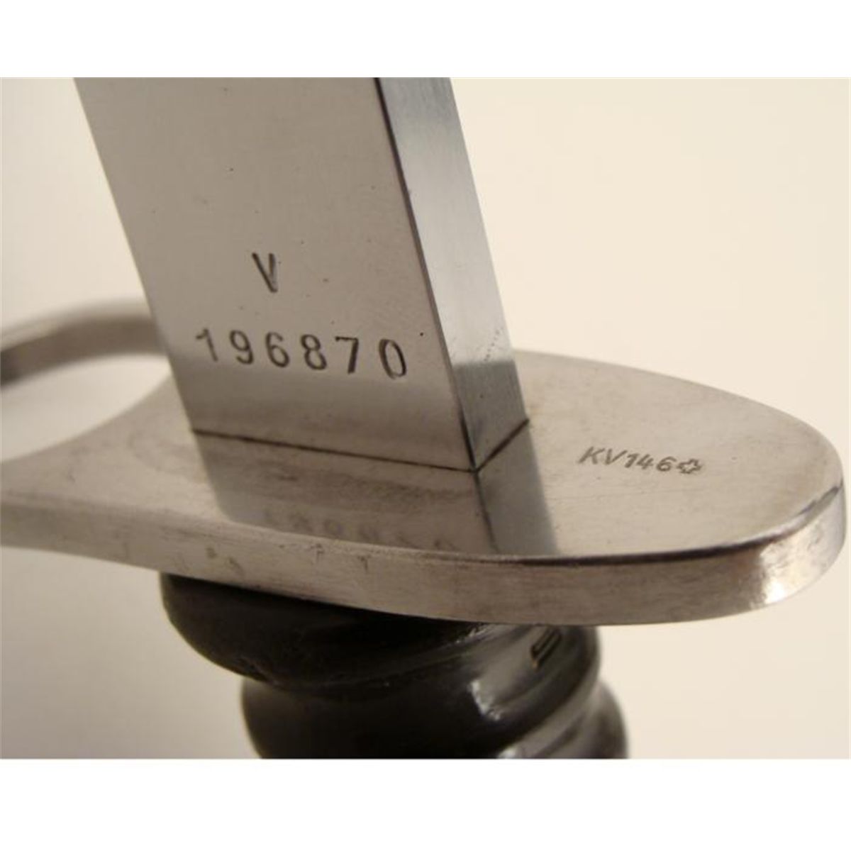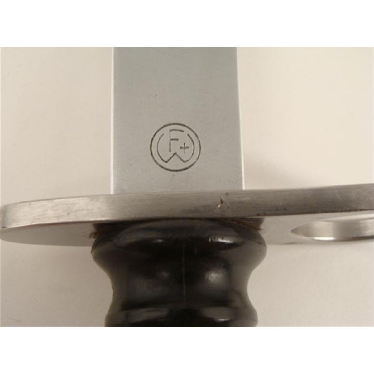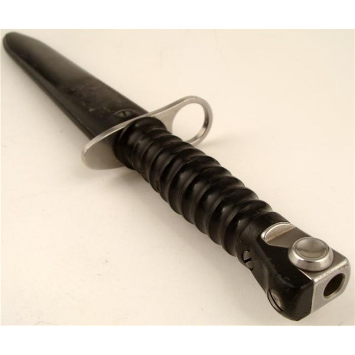 NICE M57 SWISS BAYONET-CLEAN 9 1/2" BLADE-MAKER MARKED-BLACK GRIP & SCABBARD * SUPER BLADE W/RICASSO MARKED "F W WITH SWISS CROSS" REVERSE MARKED "V-196870"-CROSSGUARD W/MUZZLE RING-RIDGED BLACK GRIP--BLACK COMPOSITE SCABBARD--O/A LENGTH 15" *