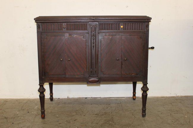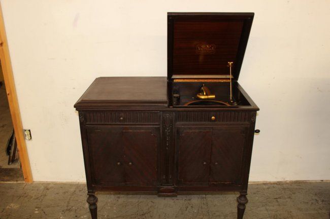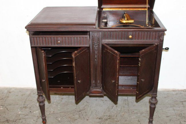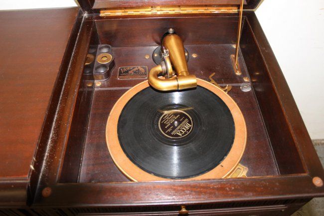 NICE MAHOGANY VICTOR VICTROLA IN EXCELLENT PLAYING CONDITION W/ 4 SHELF MUSIC CABINET AND 1 DRAWER ON SIDE - 37 X 34 X 21