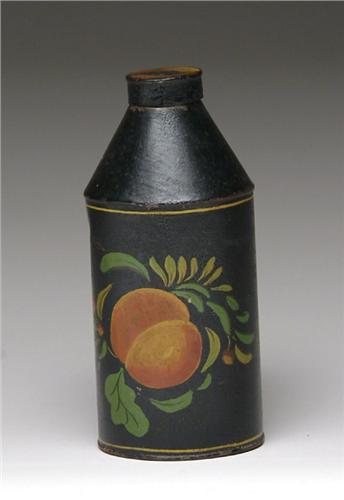 NICE OLD TIN TOLE DECORATED TEA CANISTER. Cylindrical canister with bold peach (?) decoration with green leaves on black background with yellow pinstripe. SIZE: 6-3/4in. h. CONDITION: Very good to excellent. 9-26399