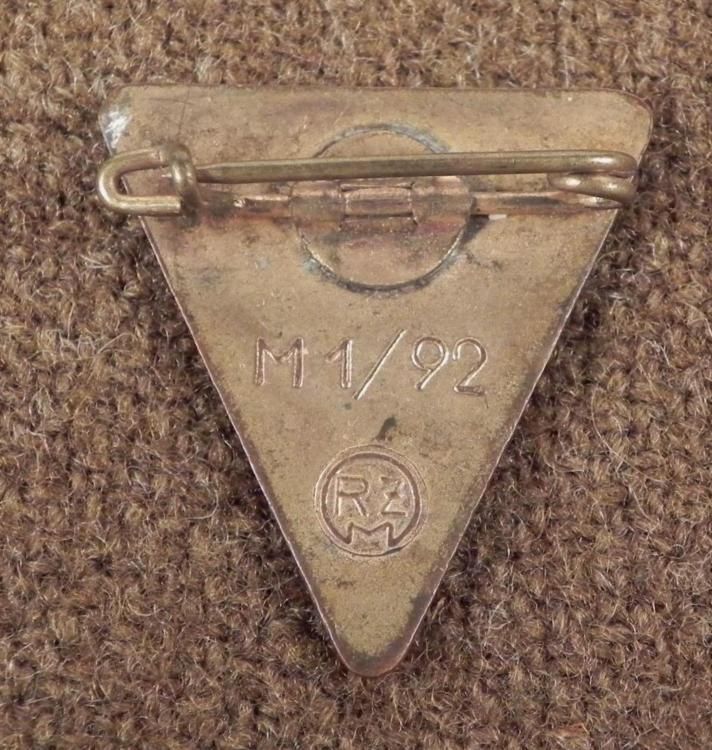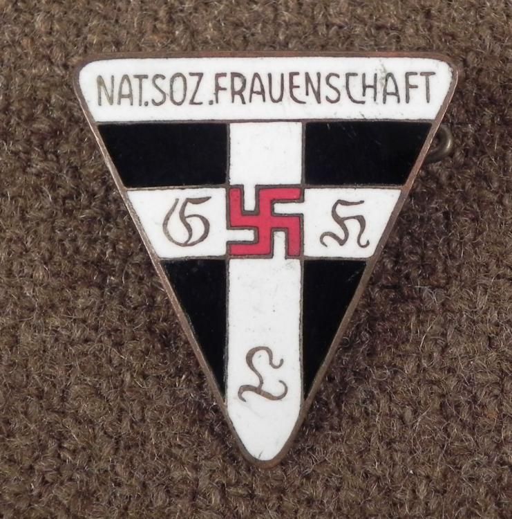 NICE ORIG NAZI NATSOZ FRAUENSCHAFT MEMBERS BADGE W/SWASTIKA-MARKED * * ENAMEL FRONT REVERSE-PINBACK & MARKED "M1-92" RZM *