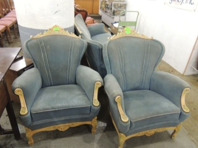 BEAUTIFUL BLUE VELVET MATCHING PAIR OF CHAIRS WITH NICE WHITE ANTIQUE FINISHED WOOD TRIM. BEAUTIFUL CONDITION. AS SHOWN.