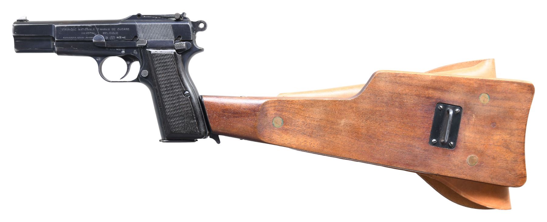 SEMI-AUTOMATIC PISTOL WITH STOCK & HOLSTER. Cal. 9mm Luger. S# 10446. Bbl. 4 5/8". Early pre-war production High Power semi-automatic pistol mfg. by Fabrique Nationale. Left side of the slide is marked with an encircled "H" towards the muzzle, followed by FABRIQUE NATIONALE D'ARMES DE GUERRE/ HERSTAL BELGIQUE/ BROWNING'S PATENT DEPOSE", above various Belgian military acceptance proofs, which are also present on the left side of the frame, and on the right side of the bbl. Metal components exhibit a blue finish overall, save for on the bbl., which is polished in-the-white. Frame is mounted with 2-piece checkered wood grips, which feature red anti-moisture paint on the interior of the panels. Dovetailed blade front sight, with tangent rear sight graduated from 50-500. Rear grip strap is slotted for a stock attachment. All serialized parts are matching and include the frame, slide and bbl. (left side). Bottom of the bbl. lug is marked "6167". MAGS: 1 13-rd. phosphate mag. with blued floorplate. UNATTACHED ACCESSORIES: 1960s-1970s pattern FN flat board stock, with brown leather holster, as properly assembled from surplus parts. Stock is properly stamped with a crown over an encircled "GC" Belgian military acceptance proof, and with a 1940 boxed "C" proof on the lug. Holster exhibits a handwritten "Fr. 95.-/ 1971/ Hotmann +/ Reinhardt" in black ink on the interior of the closure flap. CONDITION: good to very good, with metal components retaining the majority of their original arsenal blue finish, exhibiting areas of light to mild wear and thinning (primarily on edges), some scattered superficial handling marks, as well as some scattered spots of light to mild surface oxidation (primarily on the grip straps). Left side of frame exhibits a small concentrated area of mild pitting. Bore is bright, exhibiting consistent mild pitting, while retaining well defined rifling throughout. Grips are good, showing smoothing, as well as scattered superficial marks and impressions. Stock shows some mild superficial marks from handling and storage, with the brass rivets exhibiting a mellow patina. Holster remains malleable, exhibiting scattered superficial handling marks, as well as scattered spots of discoloration. A nice pre-war Belgian military High Power, with a desirable stock and holster. (24-6914/MLW). CURIO. $2,000-3,000.